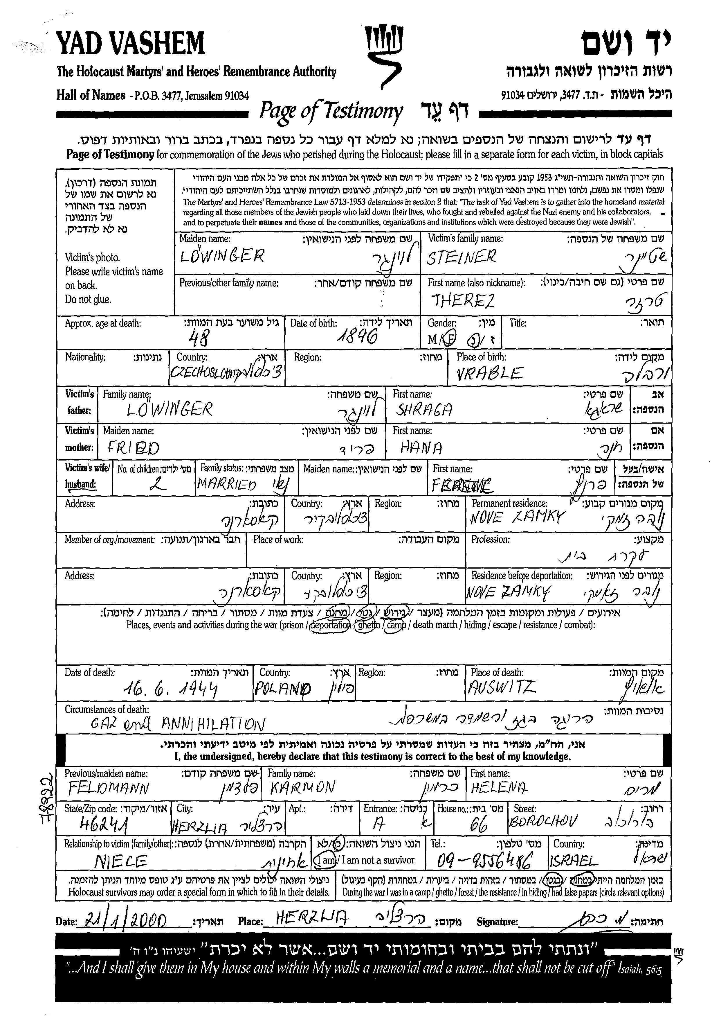 Therez Steiner, geb. Lowinger wurde im Jahr 1896 in Vrable, Tschechoslowakei geboren. Sie war die Tochter von Shraga und Hana. Sie war Hausfrau und mit Ferentz Verheiratet. Vor dem Zweiten Weltkrieg lebte sie in Nove Zamky, Tschechoslowakei. Während des Krieges war sie in Nove Zamky, Tschechoslowakei.