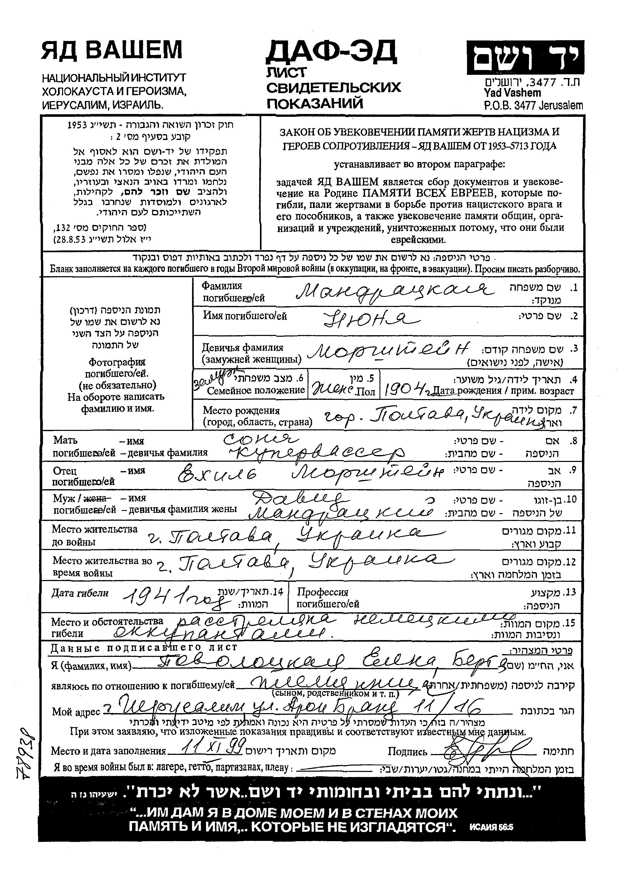 Nyunya Mandratzki Kupervasser, geb. Morshtein wurde im Jahr 1904 in Poltava, Ukraine (UdSSR) geboren. Sie war die Tochter von Yekhiel und Sonya. Sie war mit David Verheiratet. Vor dem Zweiten Weltkrieg lebte sie in Poltava, Ukraine (UdSSR). Während des Krieges war sie in Poltava, Ukraine (UdSSR).