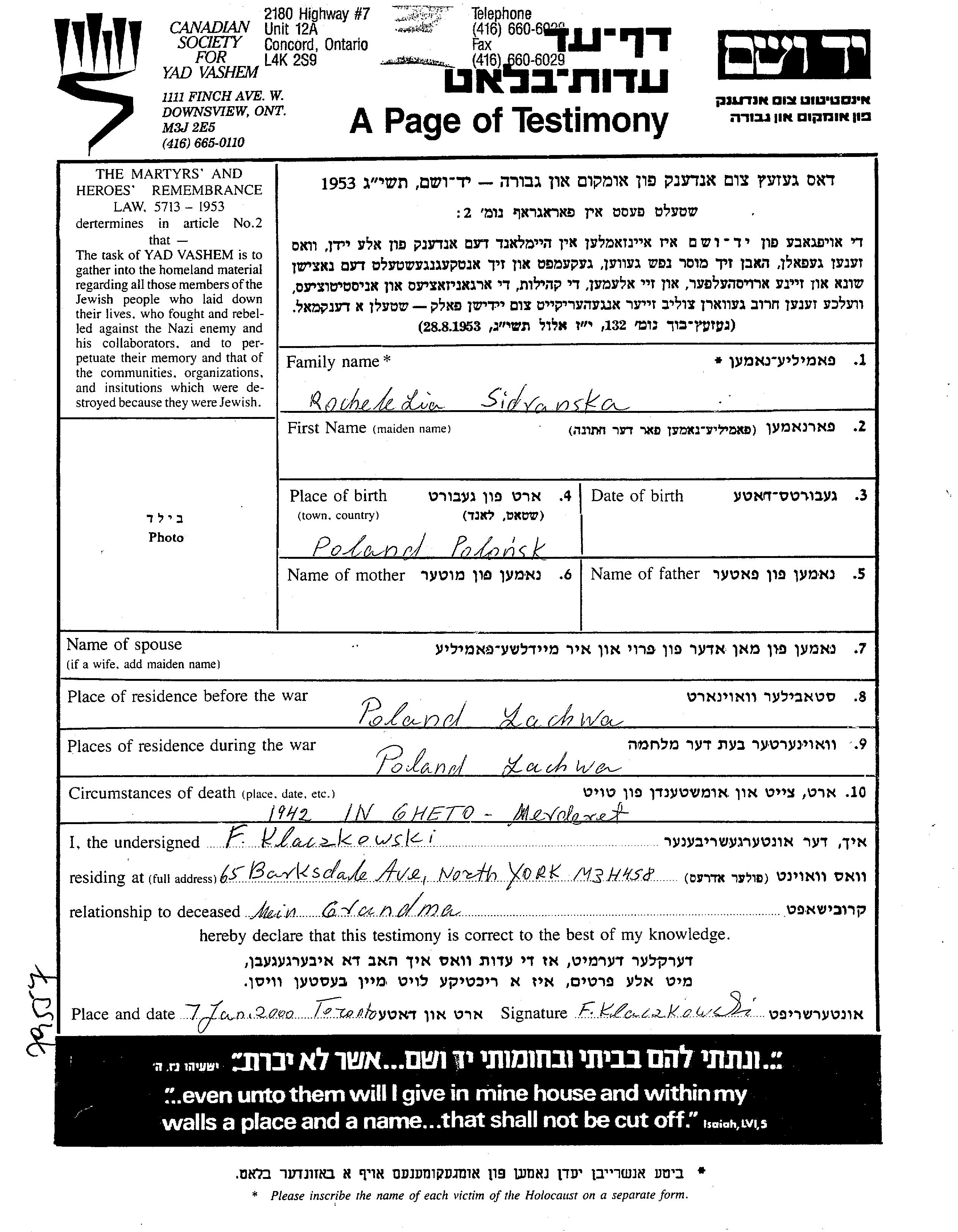 Rachele Lia Sidranski wurde in Plonsk, Polen geboren. Vor dem Zweiten Weltkrieg lebte sie in Lachwa, Polen. Während des Krieges war sie in Lachwa, Polen.