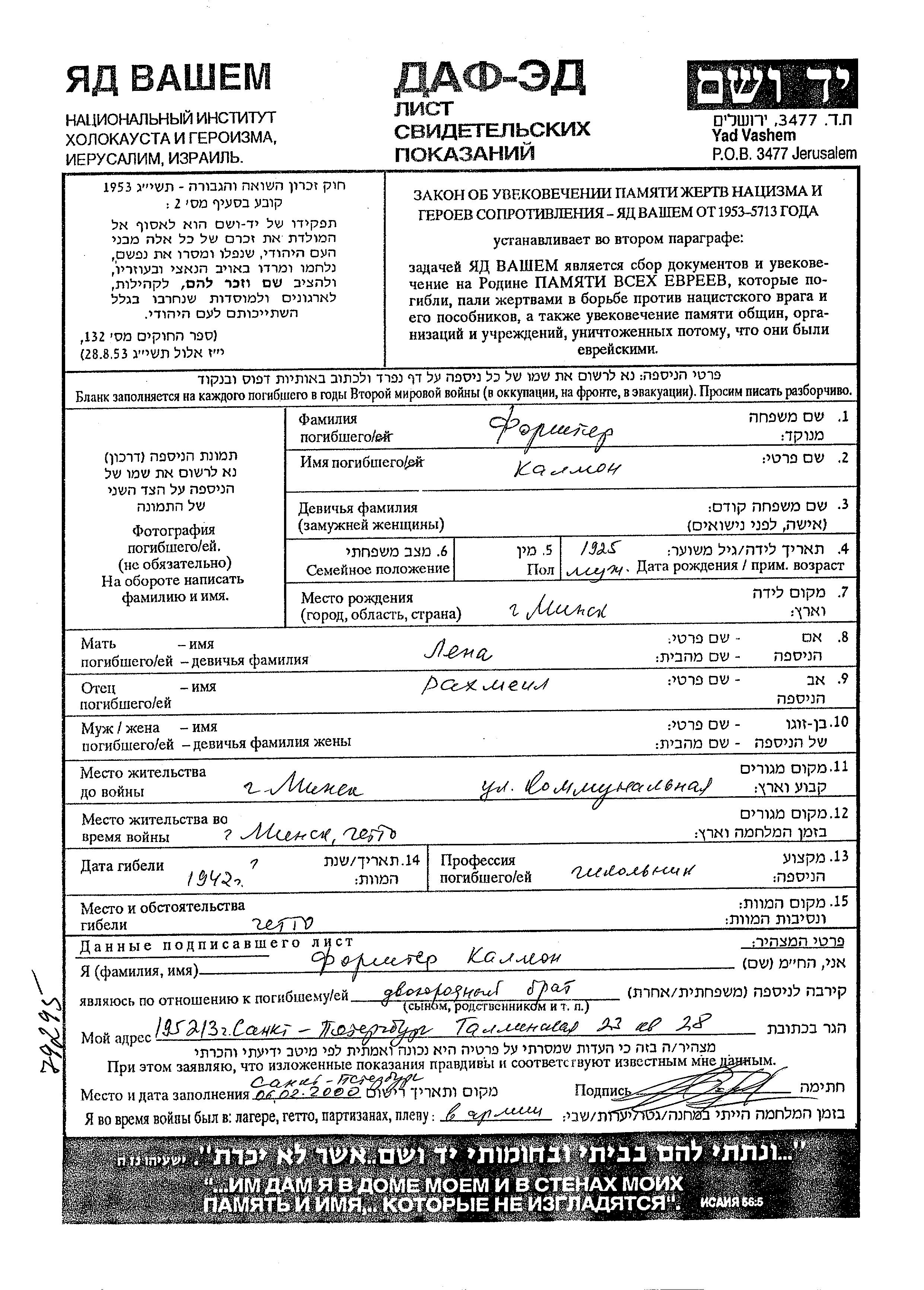 Kalman Forshter wurde im Jahr 1925 in Minsk, Weißrussland (UdSSR) geboren. Er war der Sohn von Rakhmeil und Lena. Er war Schüler/-in. Vor dem Zweiten Weltkrieg lebte er in Minsk, Weißrussland (UdSSR). Während des Krieges war er in Minsk, Weißrussland (UdSSR).