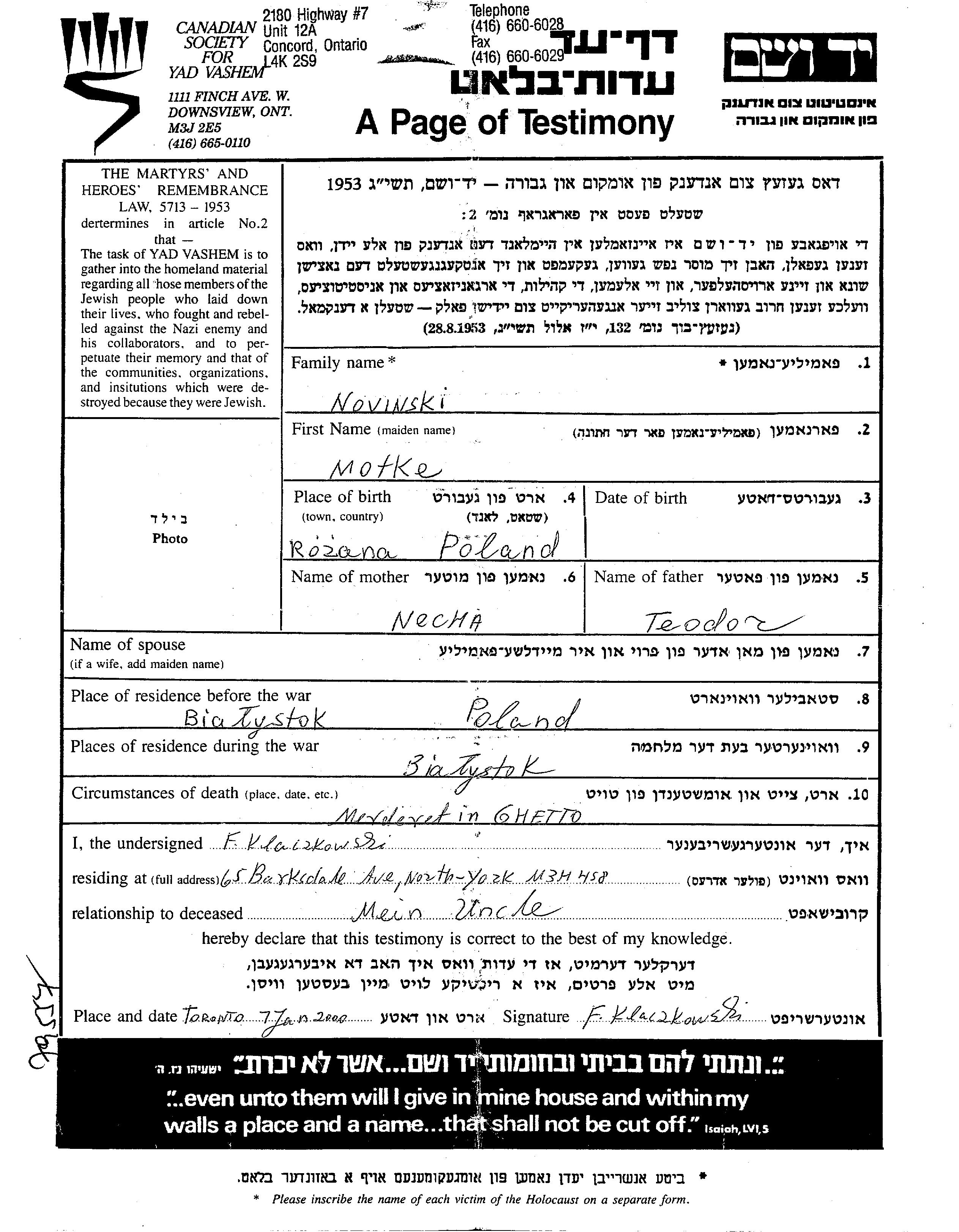 Motke Novinski wurde in Rozana, Polen geboren. Er war der Sohn von Teodor und Necha. Vor dem Zweiten Weltkrieg lebte er in Bialystok, Polen. Während des Krieges war er in Bialystok, Polen.