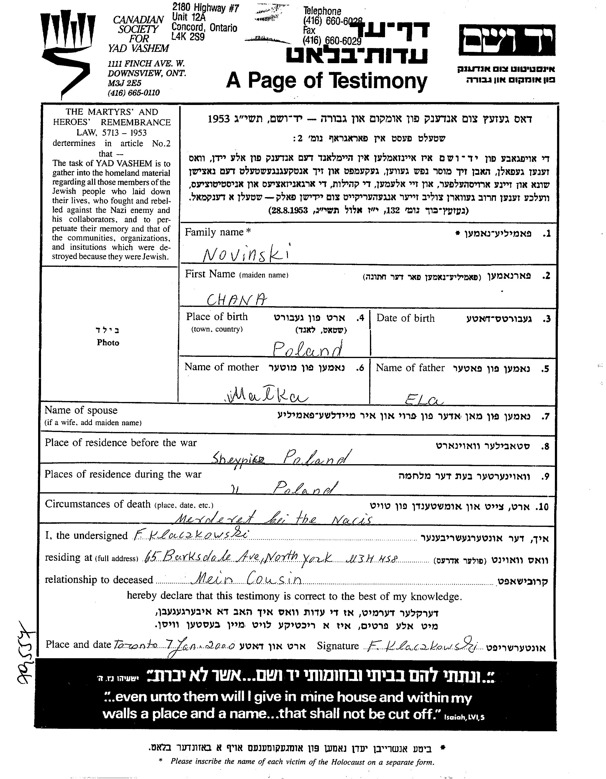 Novinski Chana Sheypicz, Polen Gedenkblatt