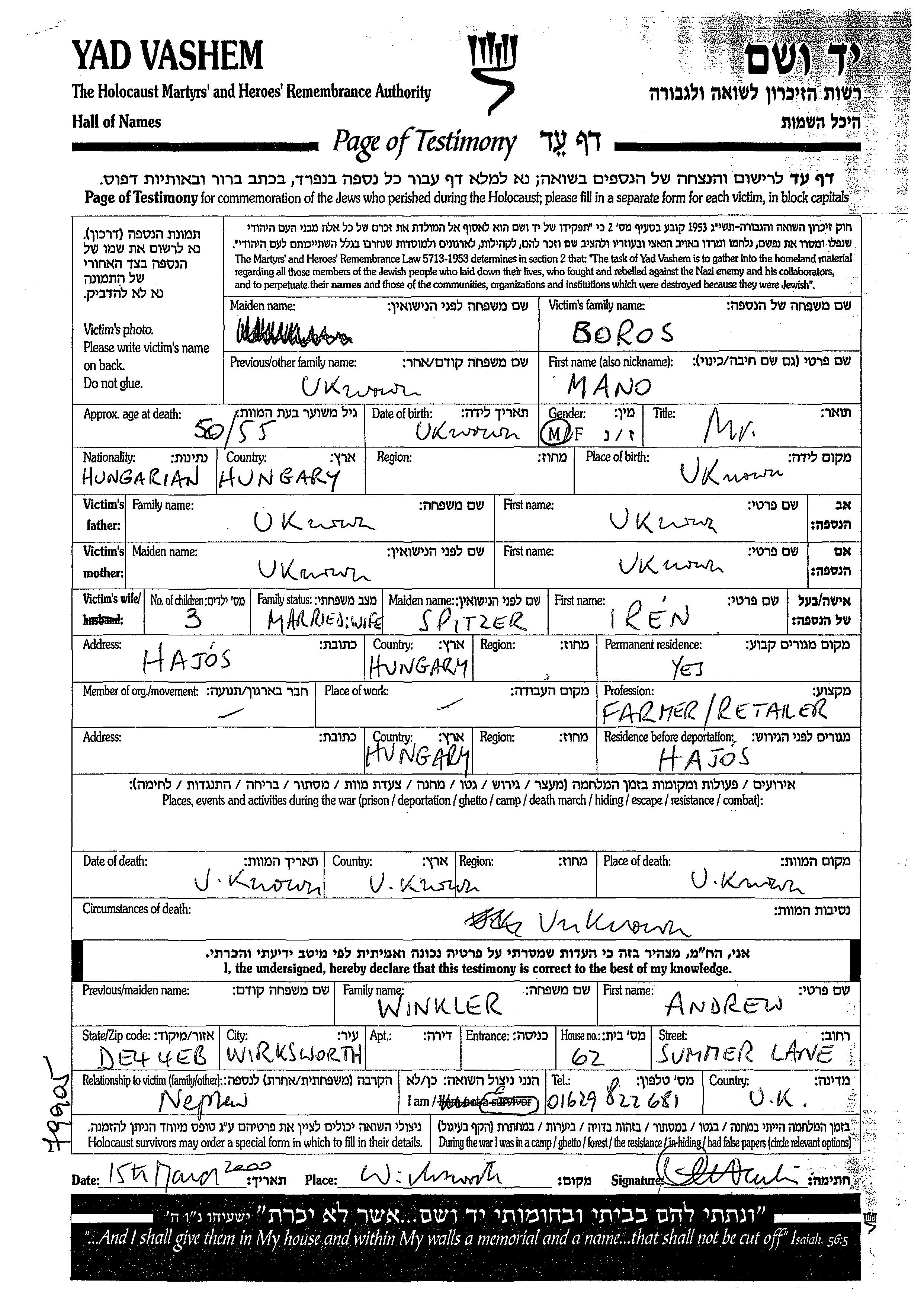 Emanuel Boros wurde in Ungarn geboren. Er war Landwirt und mit Iren, geb. Spitzer Verheiratet. Vor dem Zweiten Weltkrieg lebte er in Hajos, Ungarn. Während des Krieges war er in Hajos, Ungarn.