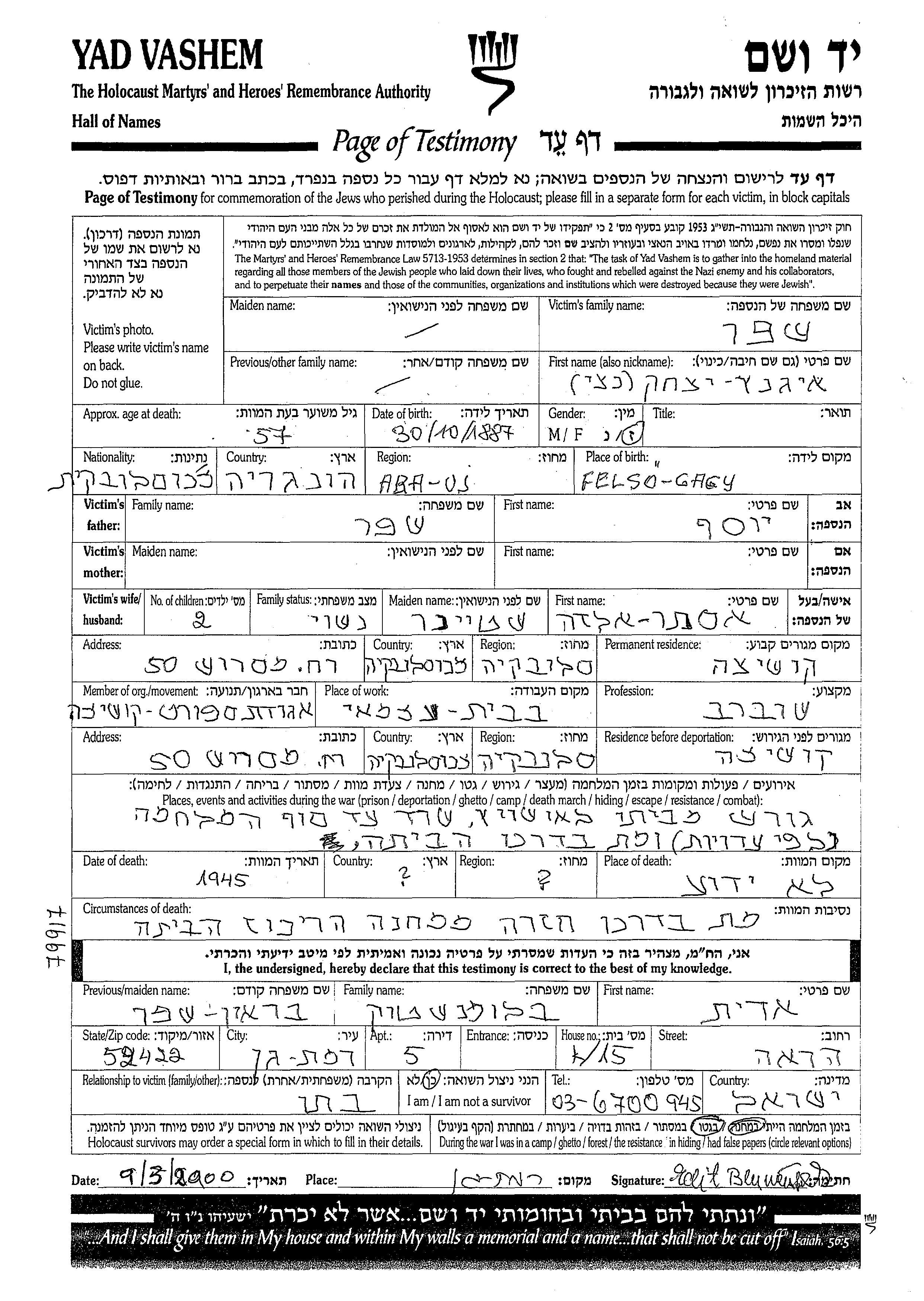 Ignatz Yitzkhak Shefer wurde im Jahr 1887 in Felso Gagy, Ungarn geboren. Er war der Sohn von Yosef. Er war Klempner und mit Ester Elza, geb. Shteiner Verheiratet. Vor dem Zweiten Weltkrieg lebte er in Kosice, Tschechoslowakei. Während des Krieges war er in Kosice, Tschechoslowakei.