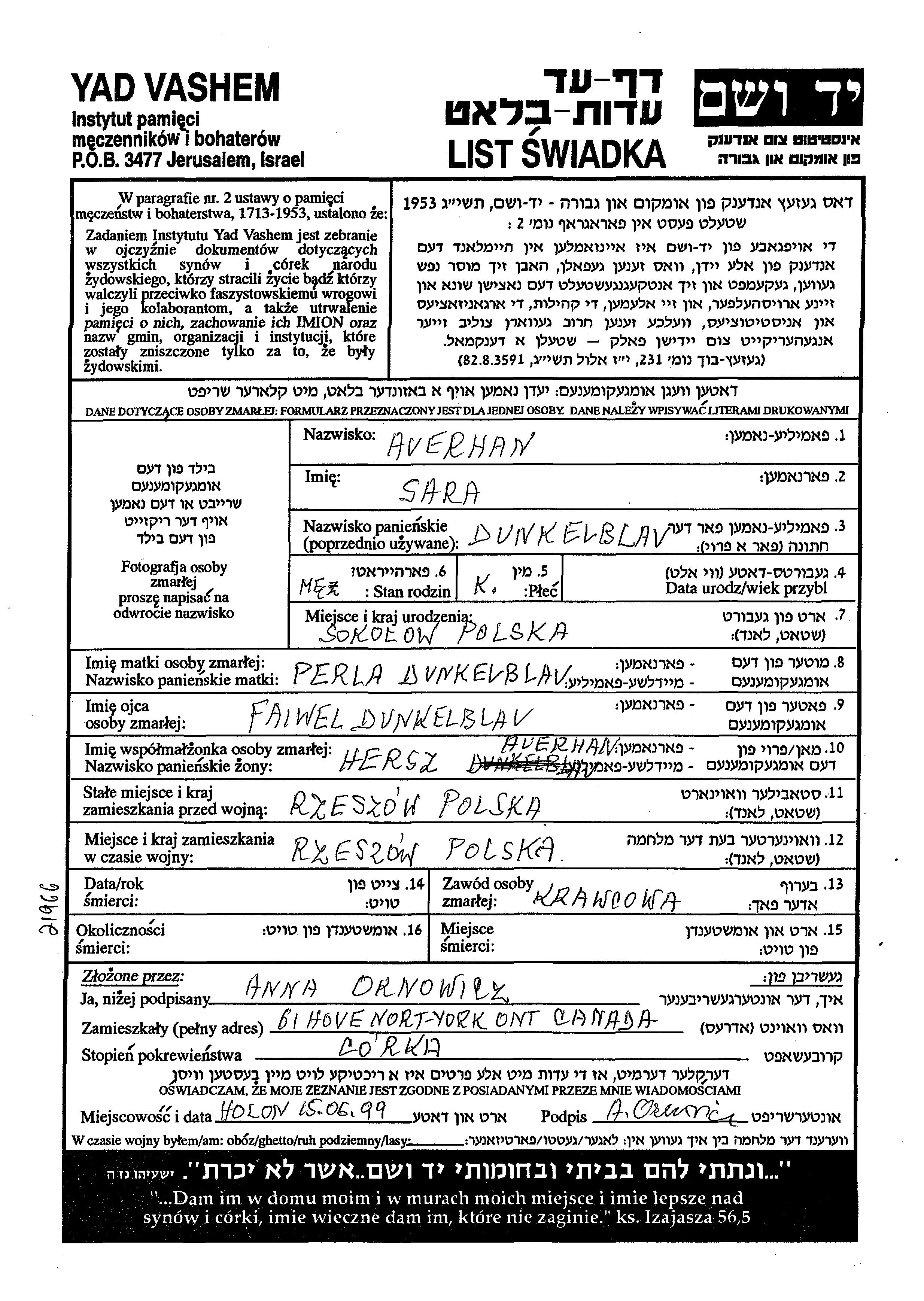 Sara Averhan, geb. Dunkelblau wurde in Sokolow, Polen geboren. Sie war die Tochter von Faiwel und Perla. Sie war Schneiderin und mit Hersz Verheiratet. Vor dem Zweiten Weltkrieg lebte sie in Rzeszow, Polen. Während des Krieges war sie in Rzeszow, Polen.