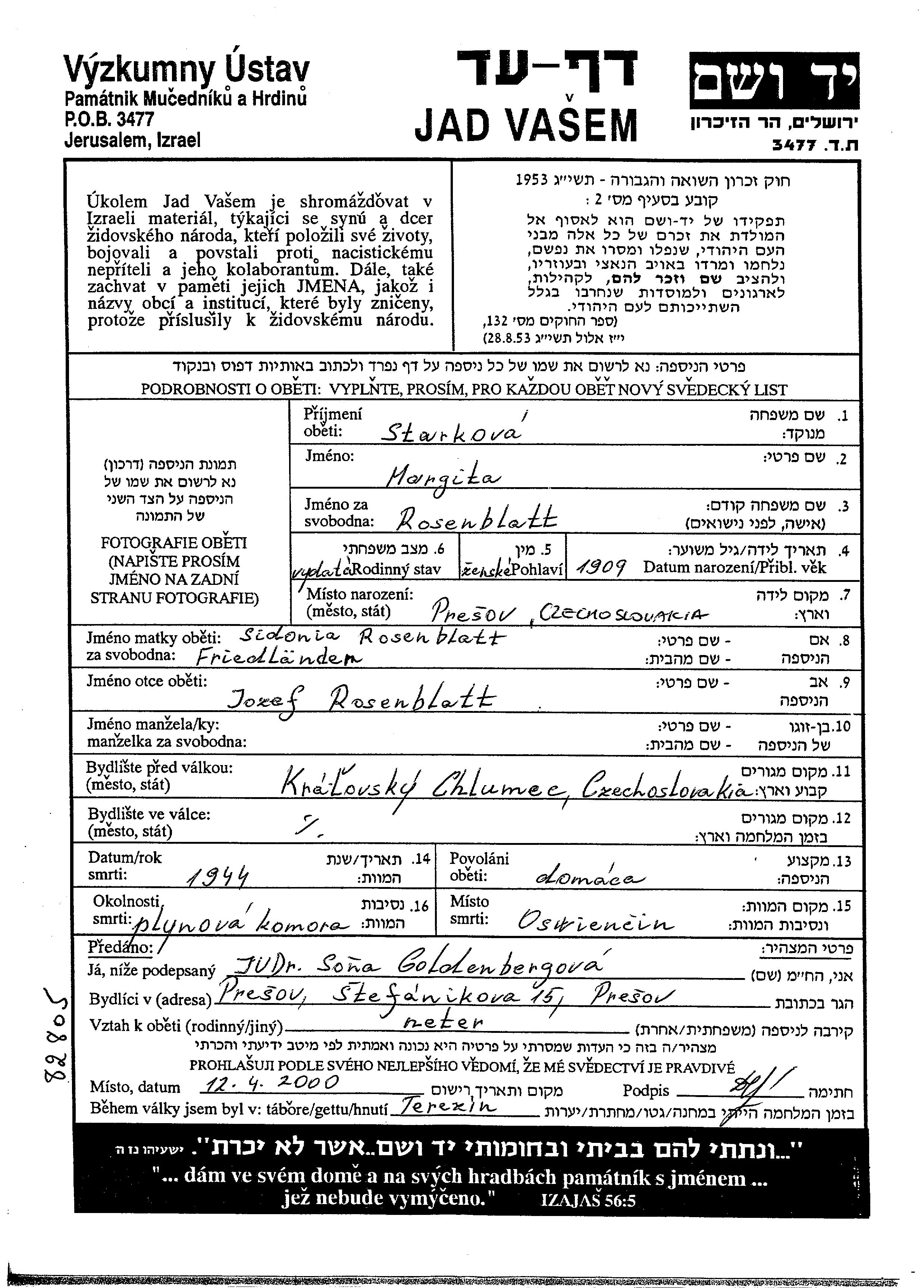 Margita Stark, geb. Rosenblatt wurde im Jahr 1909 in Presov, Tschechoslowakei geboren. Sie war die Tochter von Jozef und Sidonia. Sie war Hausfrau und Verheiratet. Vor dem Zweiten Weltkrieg lebte sie in Kralovsky Chlmec, Tschechoslowakei. Während des Krieges war sie in Kralovsky Chlmec, Tschechoslowakei.