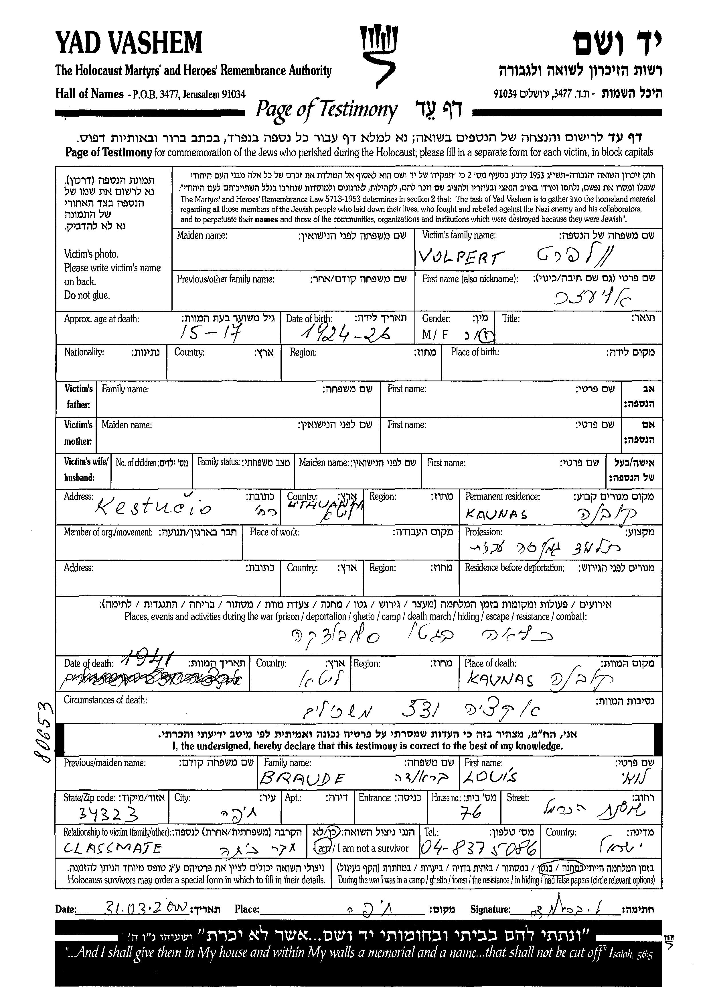 Volpert Eliezer 1924 Kaunas, Litauen Gedenkblatt