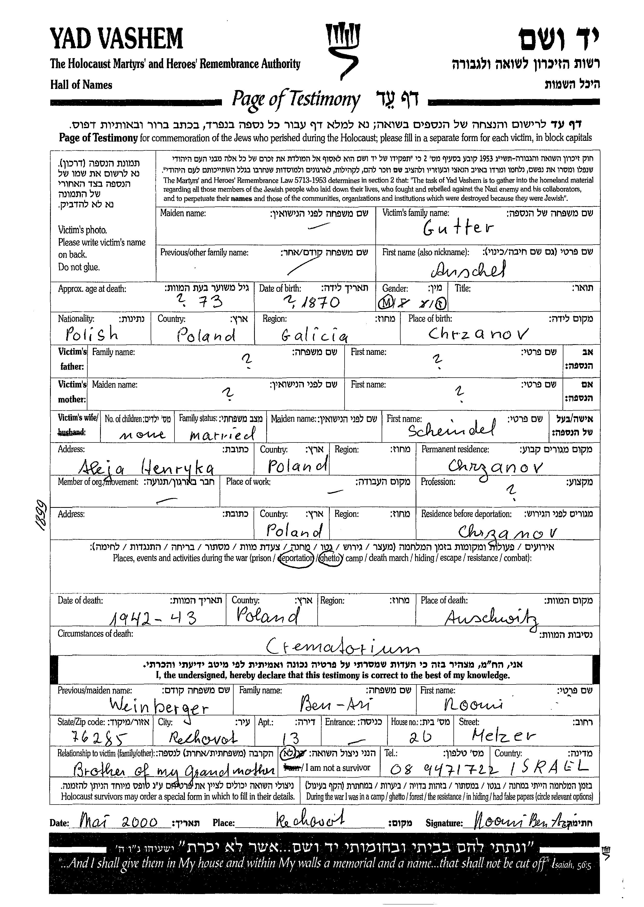 Anschel Gutter wurde im Jahr 1870 in Chrzanow, Polen geboren. Er war mit Scheindel Verheiratet. Vor dem Zweiten Weltkrieg lebte er in Chrzanow, Polen. Während des Krieges war er in Chrzanow, Polen.