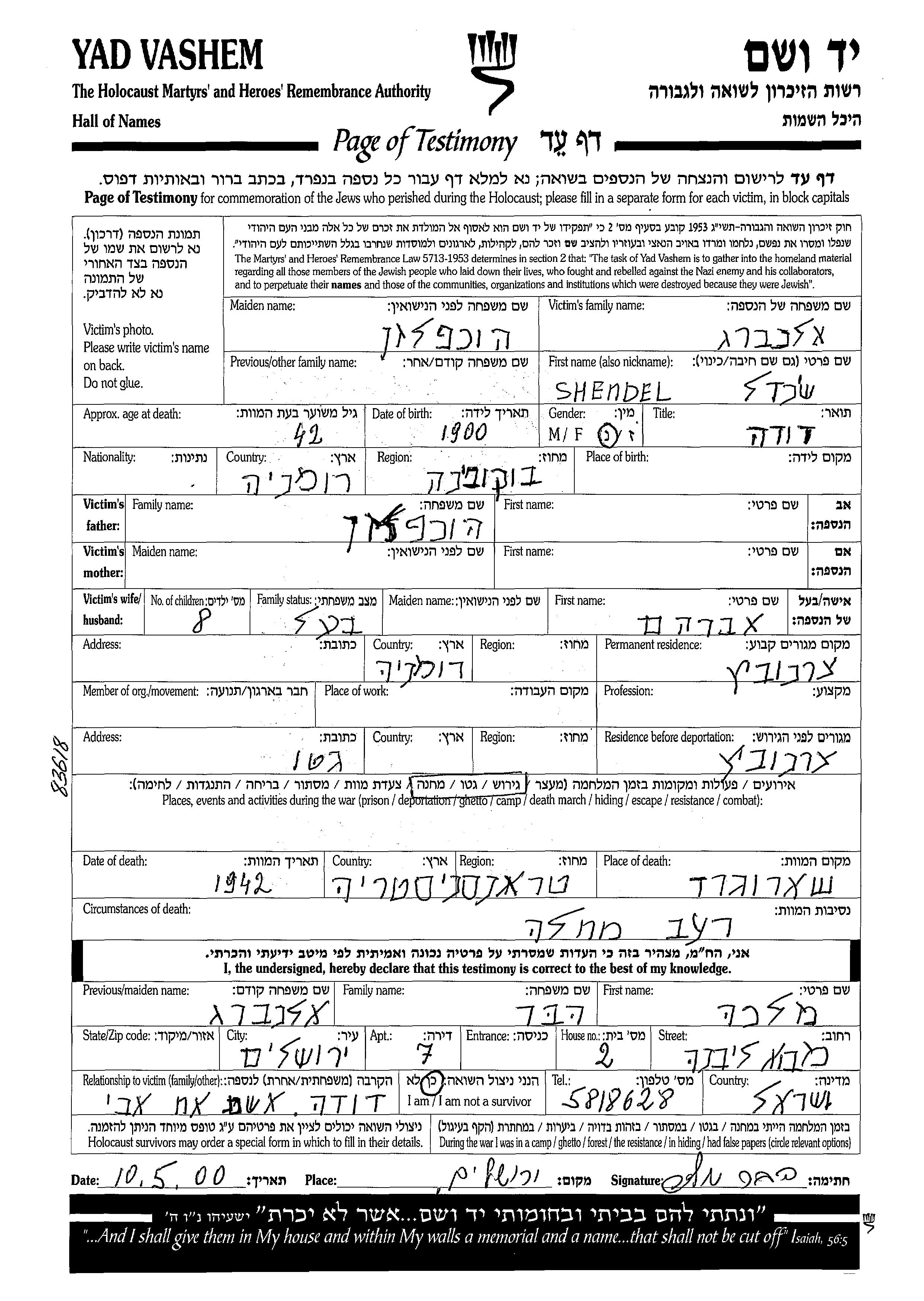Shendel wurde in der Schoah ermordet. Todesort: Sargorod, Ukraine (UdSSR) im Jahr 1942.