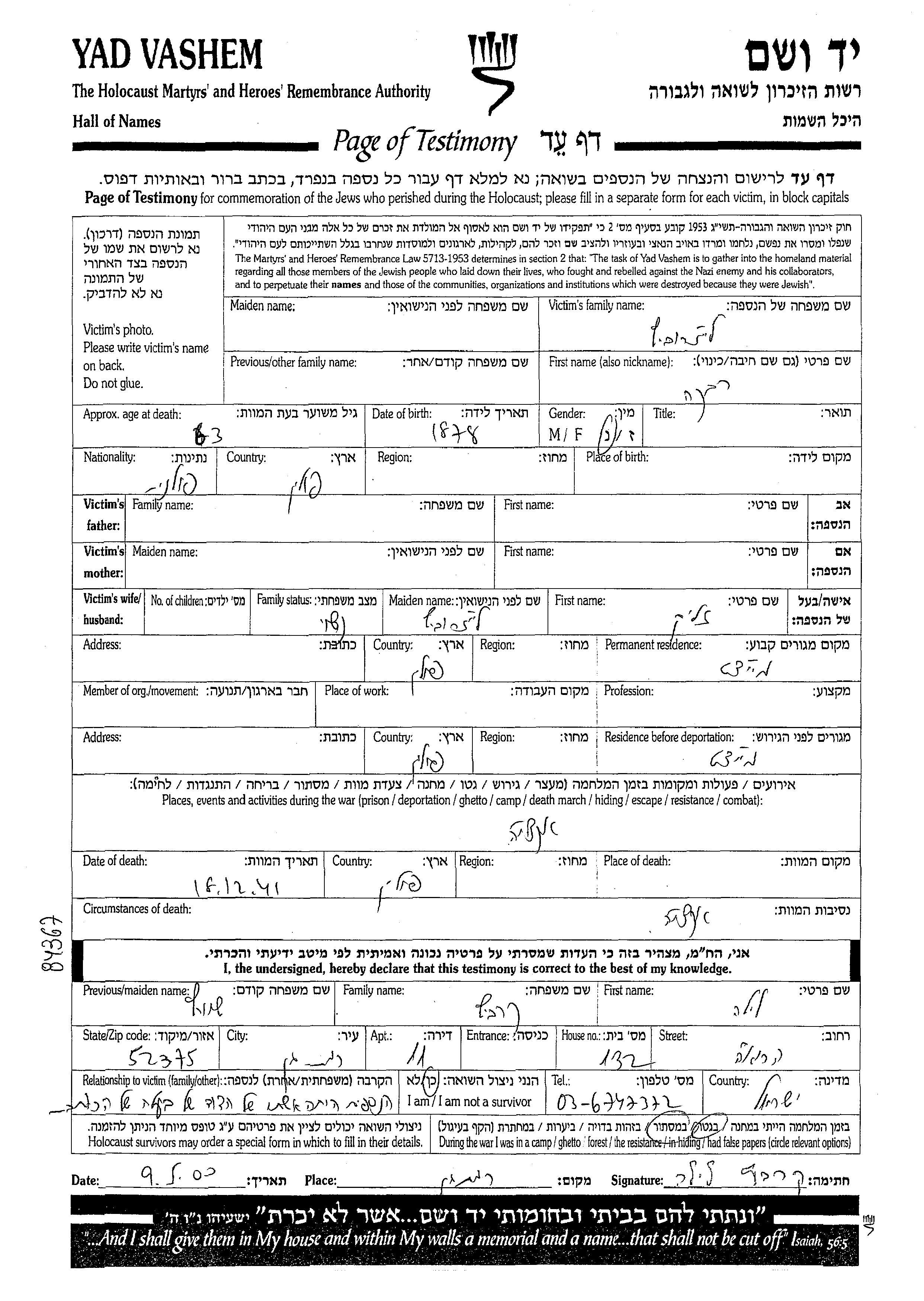 Rivka Lezerovitz wurde im Jahr 1878 in Polen geboren. Sie war mit Zelig Verheiratet. Vor dem Zweiten Weltkrieg lebte sie in Meicet, Polen. Während des Krieges war sie in Meicet, Polen.