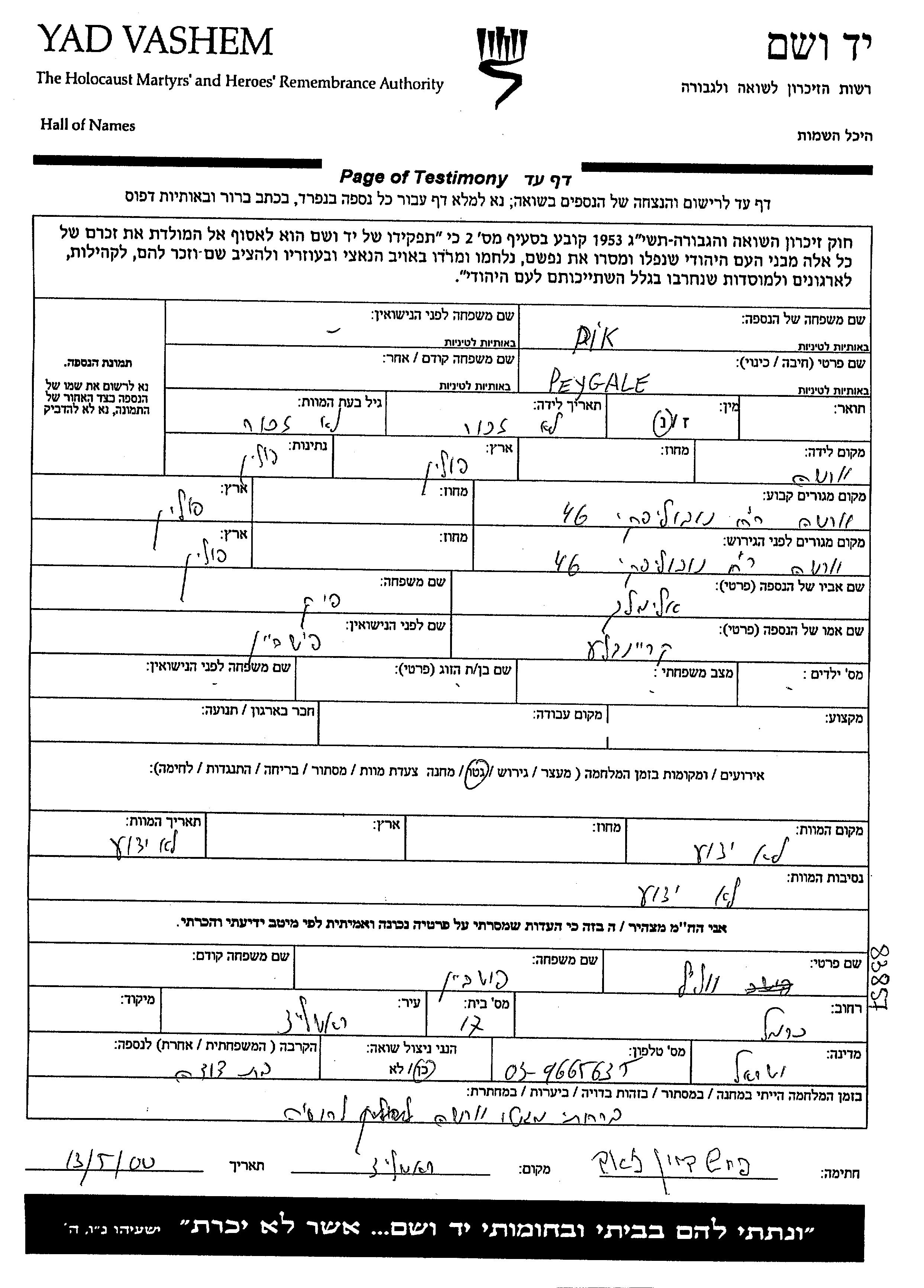 Peygale Pik wurde in Warszawa, Polen geboren. Sie war die Tochter von Eliezer und Kreina. Vor dem Zweiten Weltkrieg lebte sie in Warszawa, Polen. Während des Krieges war sie in Warszawa, Polen.