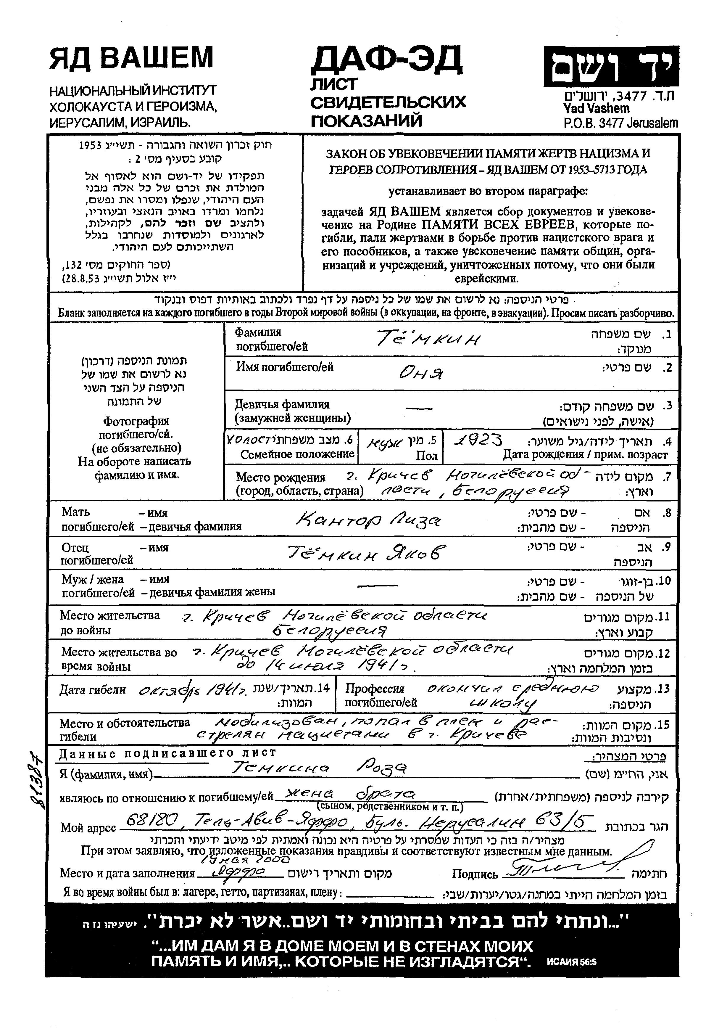 Onya Tyomkin wurde im Jahr 1923 in Krichev, Weißrussland (UdSSR) geboren. Er war der Sohn von Yakov und Liza. Er war Ledig. Vor dem Zweiten Weltkrieg lebte er in Krichev, Weißrussland (UdSSR). Während des Krieges war er in die Sowjetischen Streitkräfte.