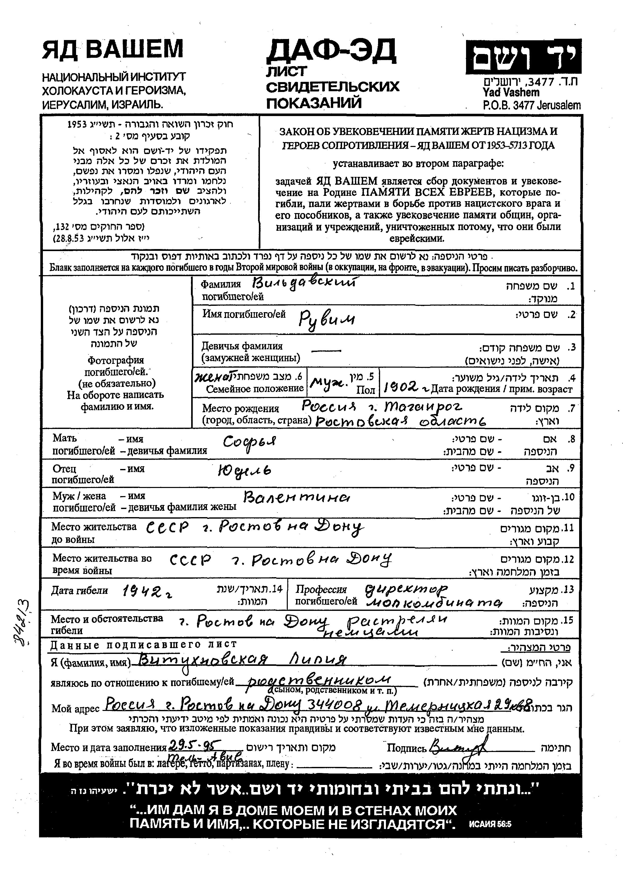 Ruvim Vildavski wurde im Jahr 1902 in Taganrog, Russland (UdSSR) geboren. Er war der Sohn von Yudel und Sofia. Er war Fabrikdirektor/-in und mit Valentina Verheiratet. Vor dem Zweiten Weltkrieg lebte er in Rostov na Donu, Russland (UdSSR). Während des Krieges war er in Rostov na Donu, Russland (UdSSR).