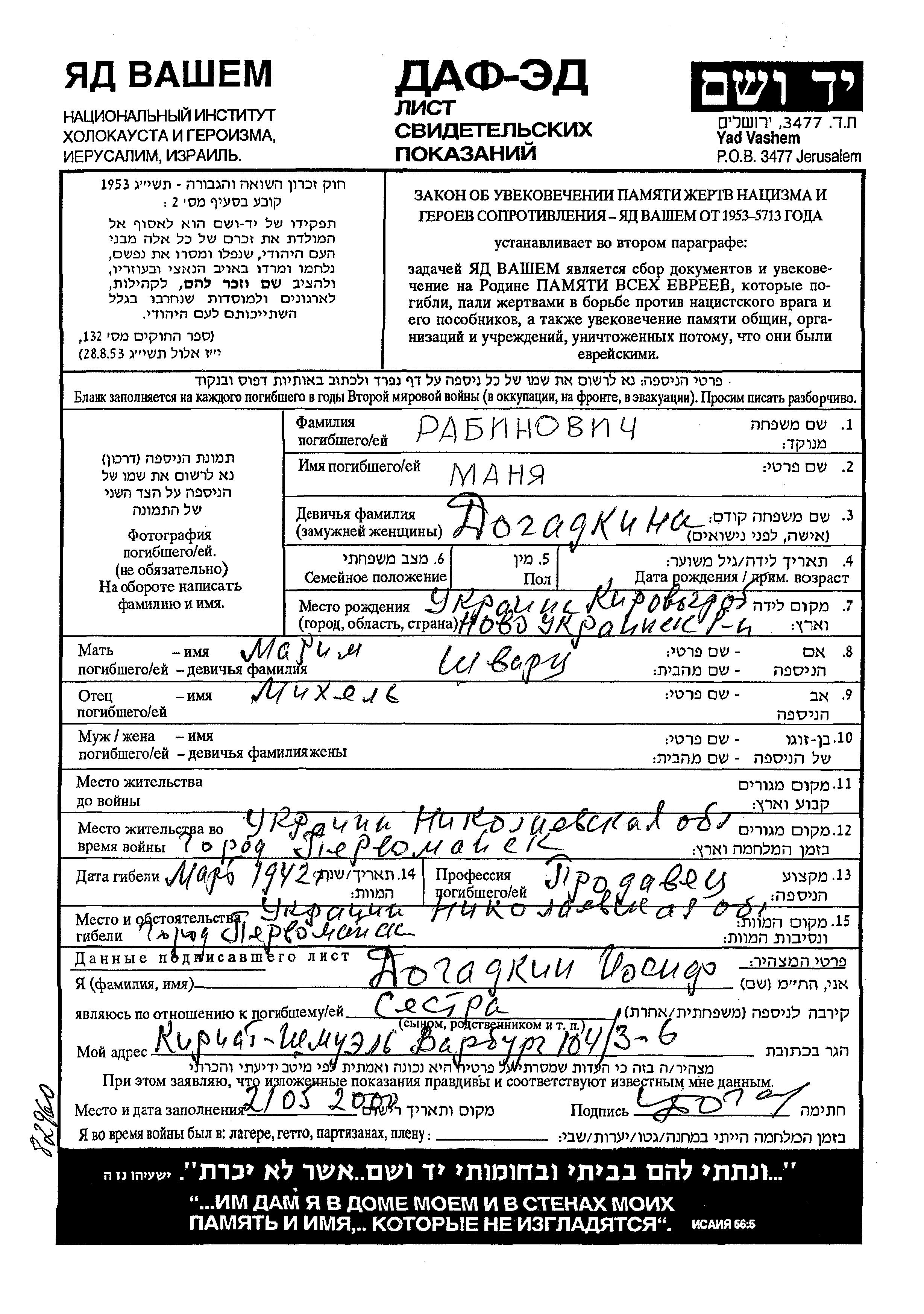 Manya Rabinovich Shvartz, geb. Dogadkin wurde in Kirovograd, Ukraine (UdSSR) geboren. Sie war die Tochter von Mikhel und Marim. Sie war Verkäufer/-in und Verheiratet. Während des Krieges war sie in Pervomaysk, Ukraine (UdSSR).