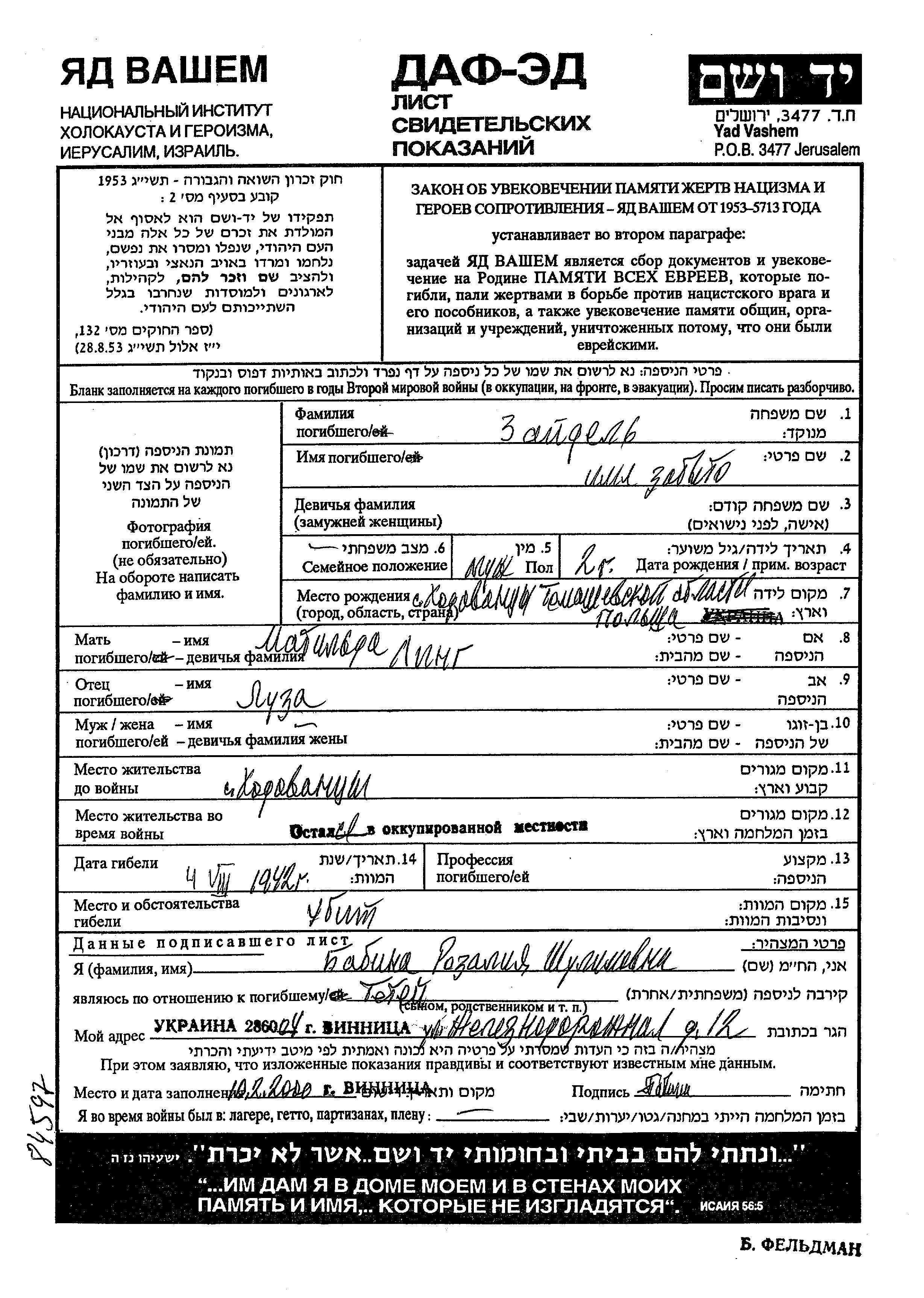 Zeidel Vorname unbekannt Chodywance, Polen Gedenkblatt