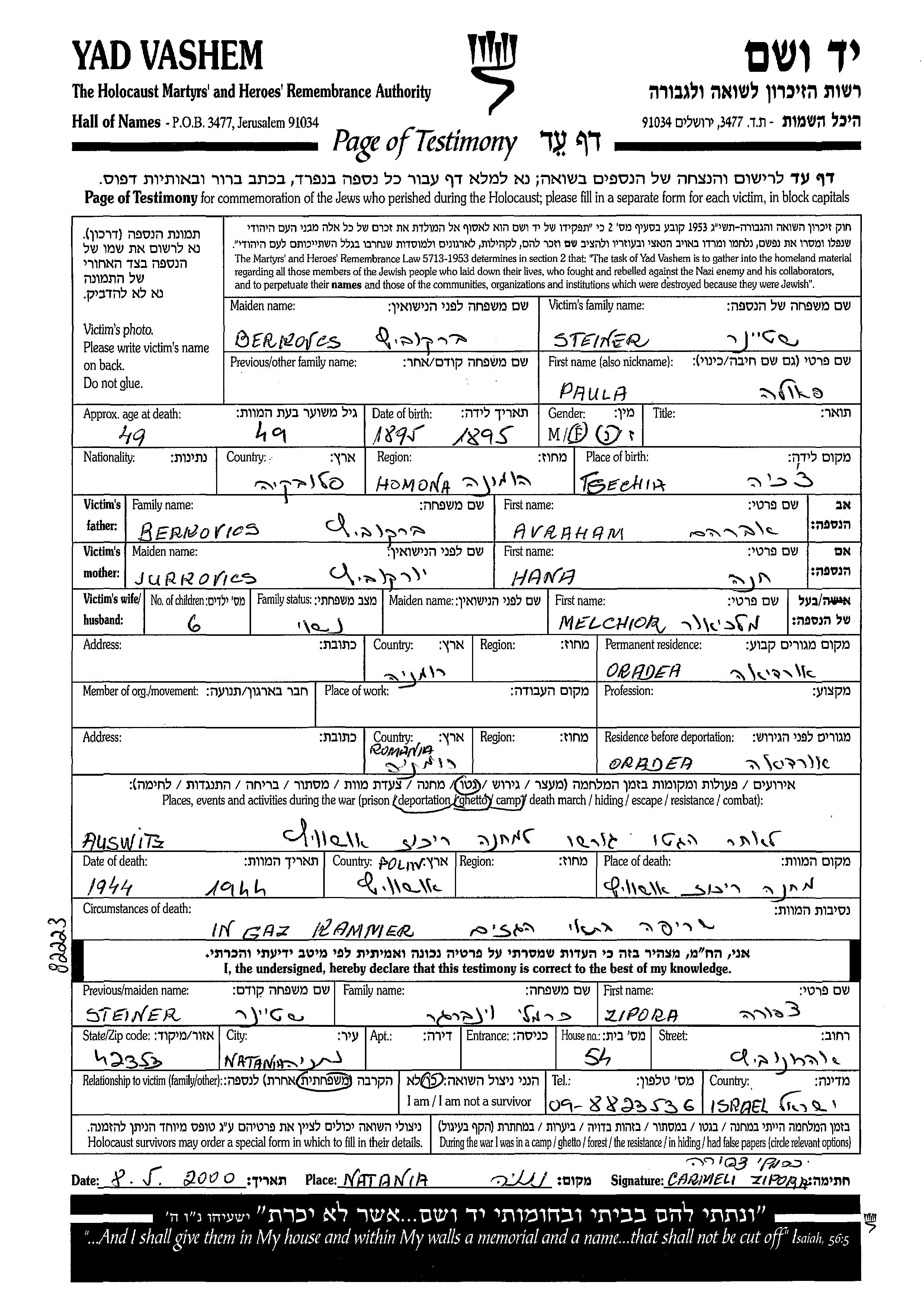 Paula Steiner, geb. Berkovics wurde im Jahr 1895 in Homonna, Tschechoslowakei geboren. Sie war die Tochter von Avraham und Hana. Sie war mit Melchior Verheiratet. Vor dem Zweiten Weltkrieg lebte sie in Oradea, Rumänien. Während des Krieges war sie in Oradea Mare, Rumänien.