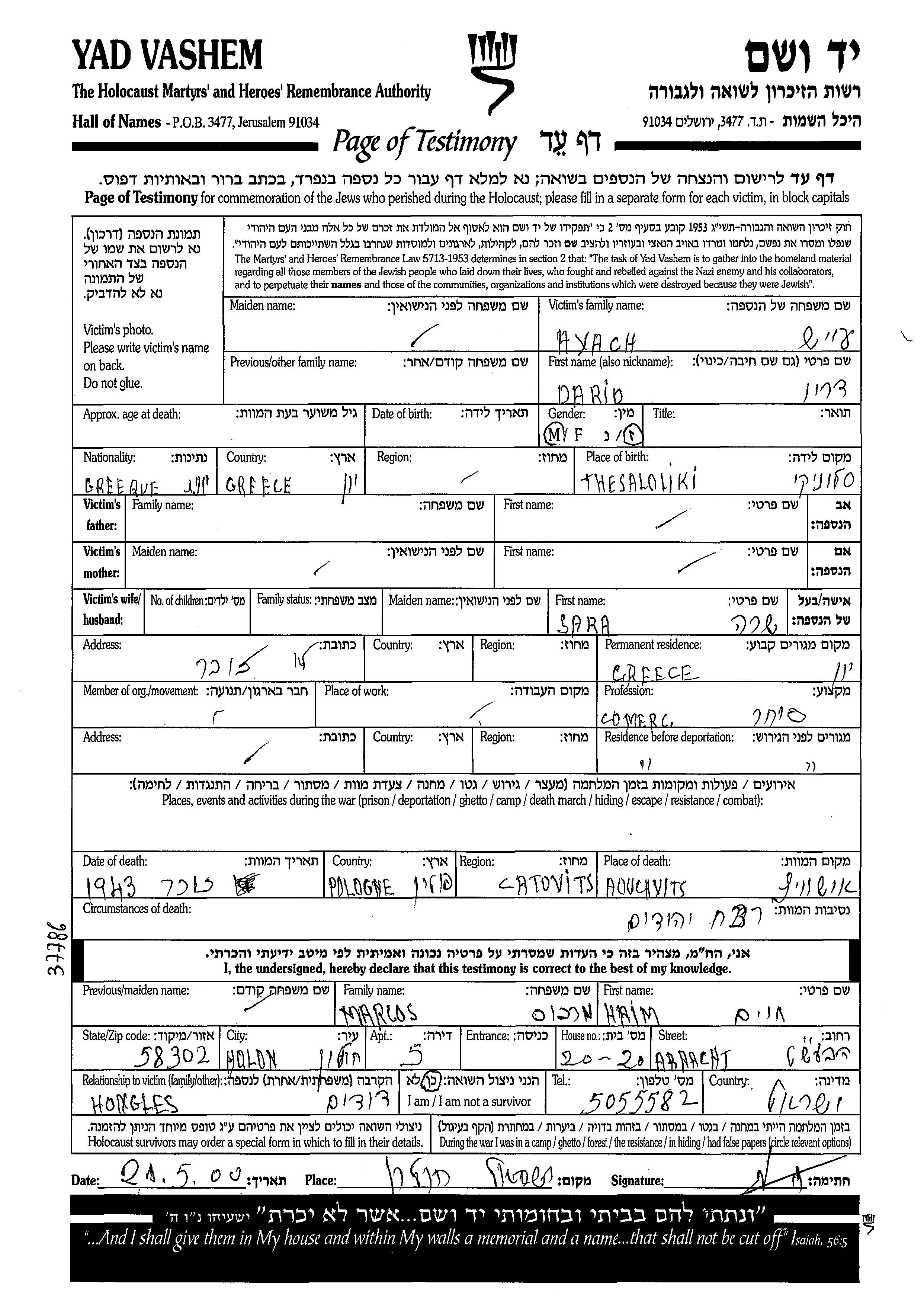 Dario Ayach wurde in Thessaloniki, Griechenland geboren. Er war Kaufmann/-frau und mit Sara Verheiratet. Vor dem Zweiten Weltkrieg lebte er in Griechenland. Während des Krieges war er in Griechenland.