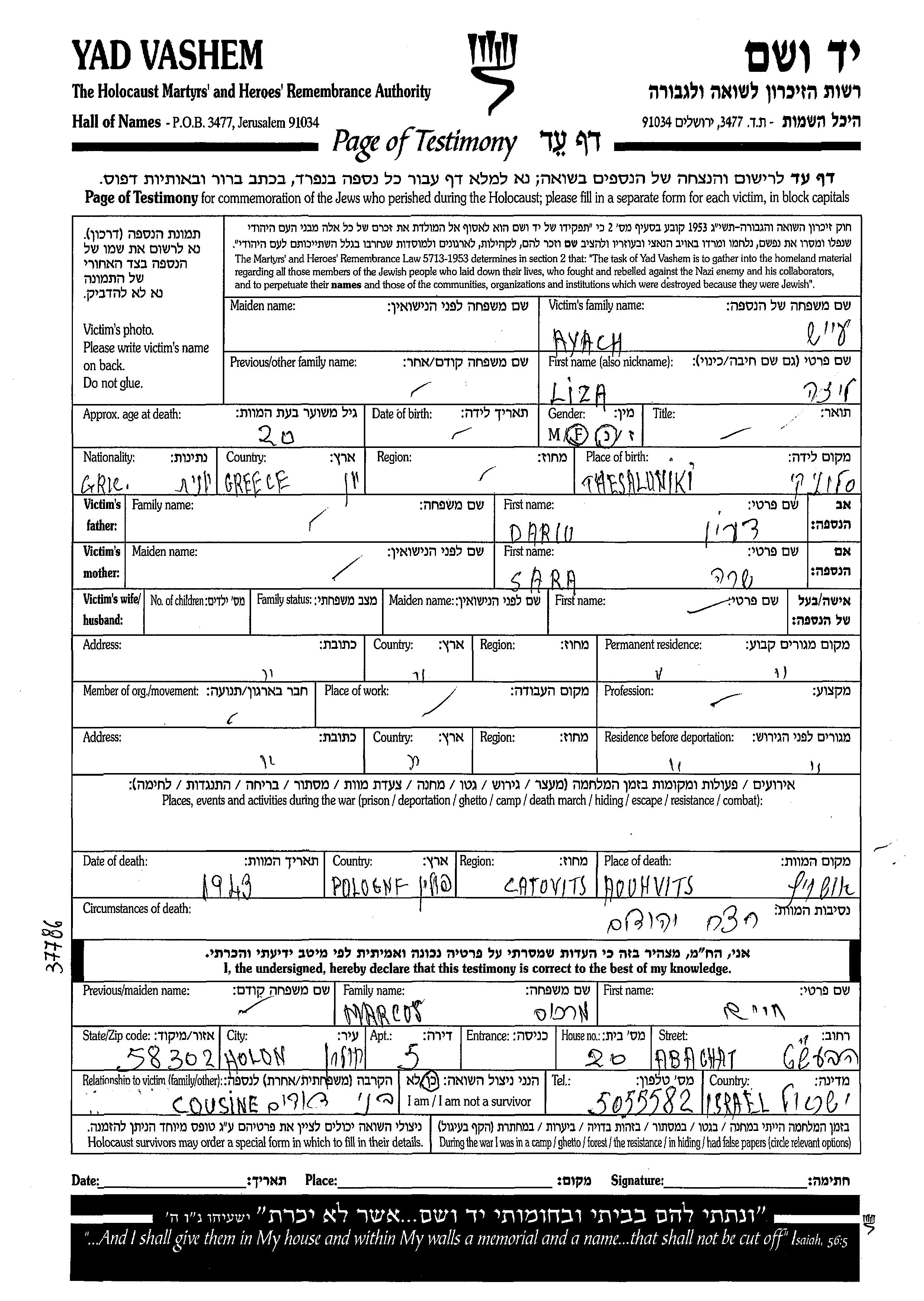 Liza Ayach wurde in Thessaloniki, Griechenland geboren. Sie war die Tochter von Dariu und Sara. Vor dem Zweiten Weltkrieg lebte sie in Thessaloniki, Griechenland. Während des Krieges war sie in Thessaloniki, Griechenland.