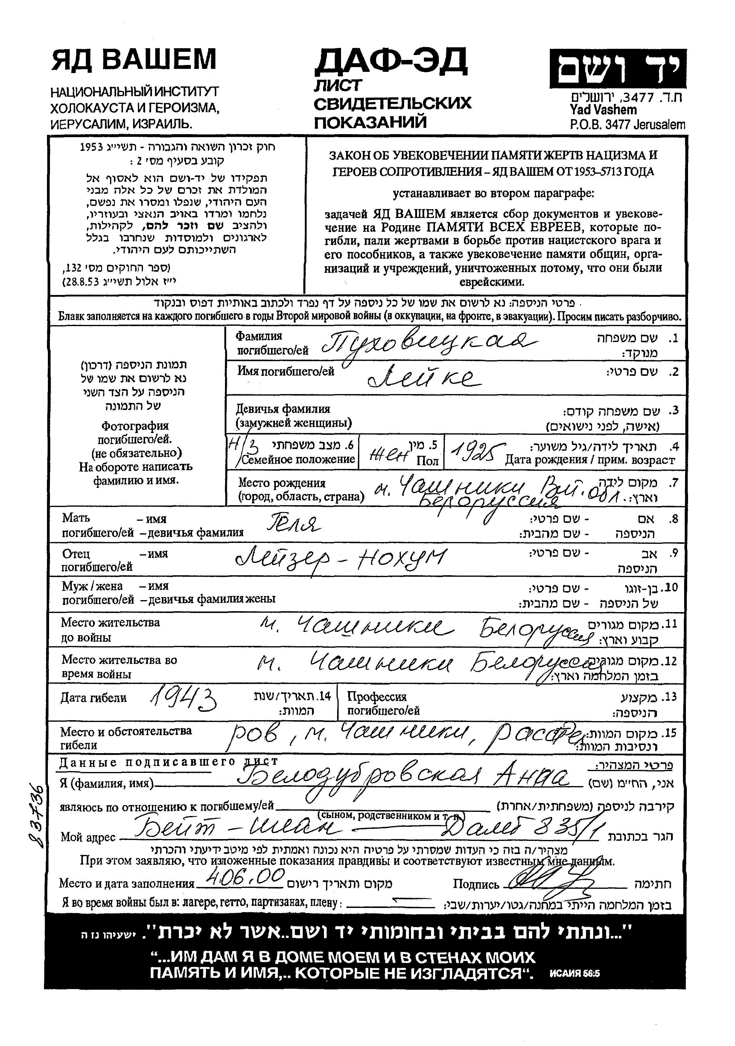 Leike Pukhovitzki wurde im Jahr 1925 in Chashniki, Weißrussland (UdSSR) geboren. Sie war die Tochter von Nokhum Leizer und Gelya. Sie war Ledig. Vor dem Zweiten Weltkrieg lebte sie in Chashniki, Weißrussland (UdSSR). Während des Krieges war sie in Chashniki, Weißrussland (UdSSR).