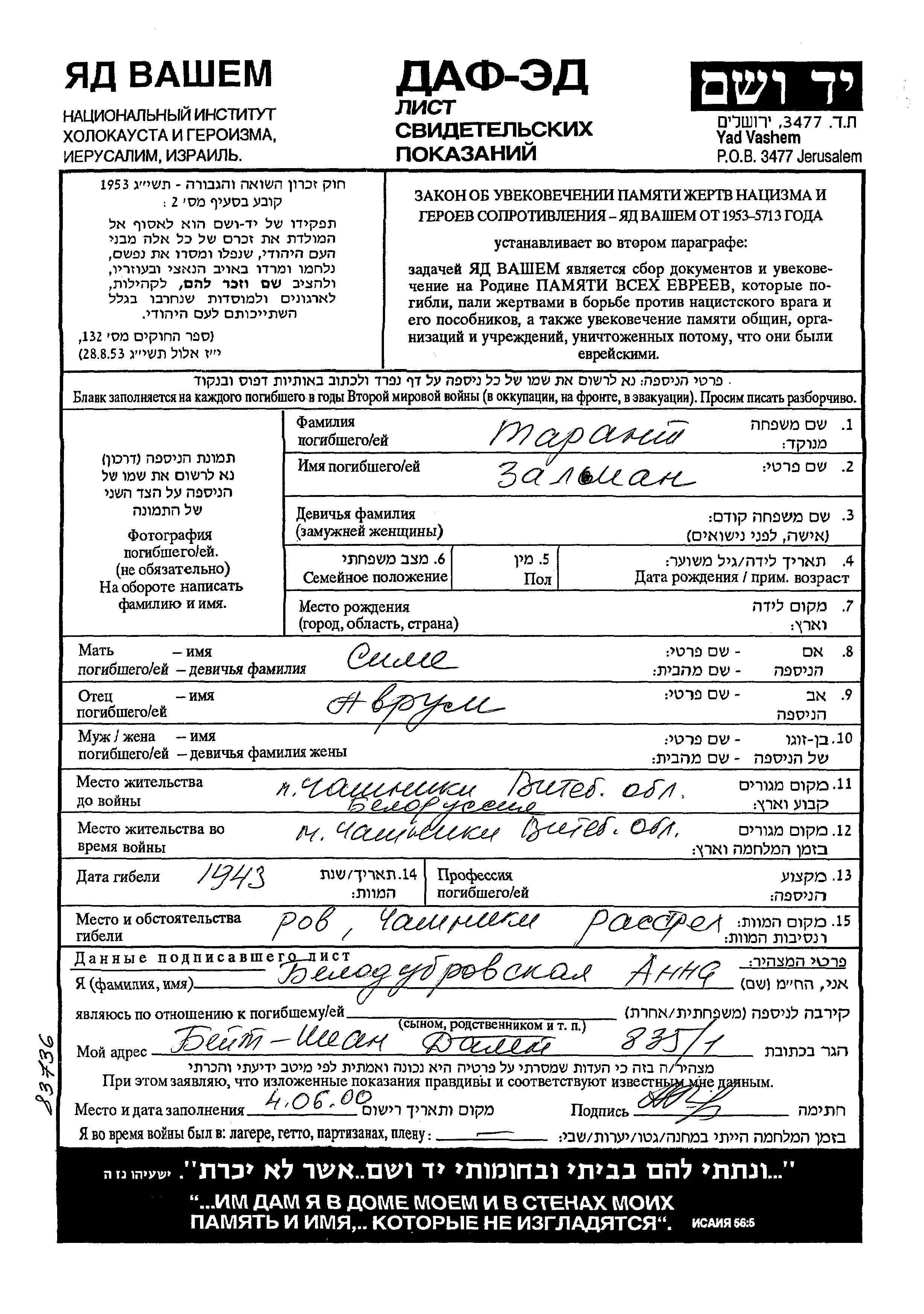 Tarant Zalman Chashniki, Weißrussland (UdSSR) Gedenkblatt