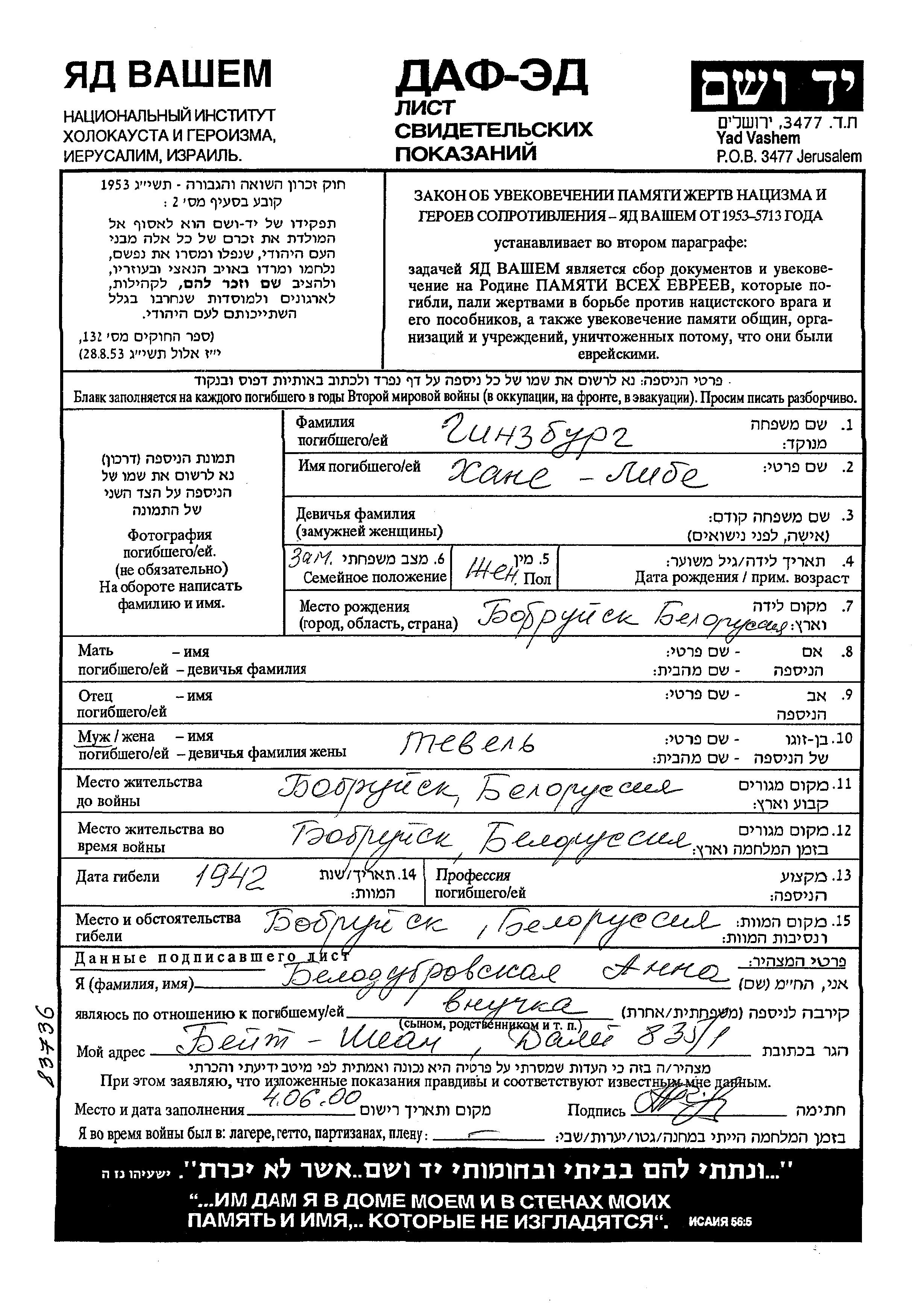 Khane Liba Ginzburg wurde in Bobruysk, Weißrussland (UdSSR) geboren. Sie war mit Tevel Verheiratet. Vor dem Zweiten Weltkrieg lebte sie in Bobruysk, Weißrussland (UdSSR). Während des Krieges war sie in Bobruysk, Weißrussland (UdSSR).
