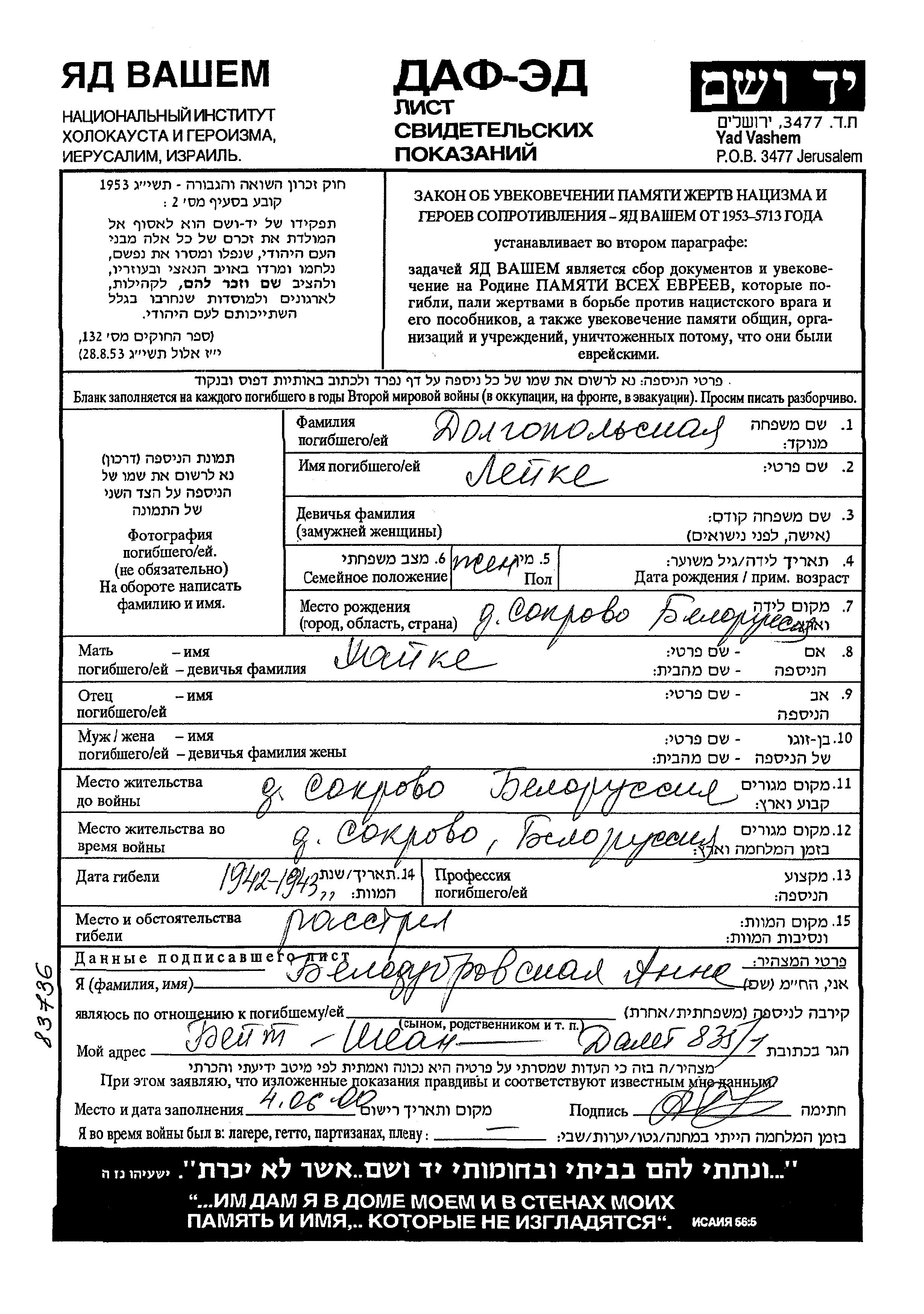 Leike Dolgopolski wurde in Sokorevo, Weißrussland (UdSSR) geboren. Sie war die Tochter von Khaike. Vor dem Zweiten Weltkrieg lebte sie in Sokorevo, Weißrussland (UdSSR). Während des Krieges war sie in Sokorevo, Weißrussland (UdSSR).