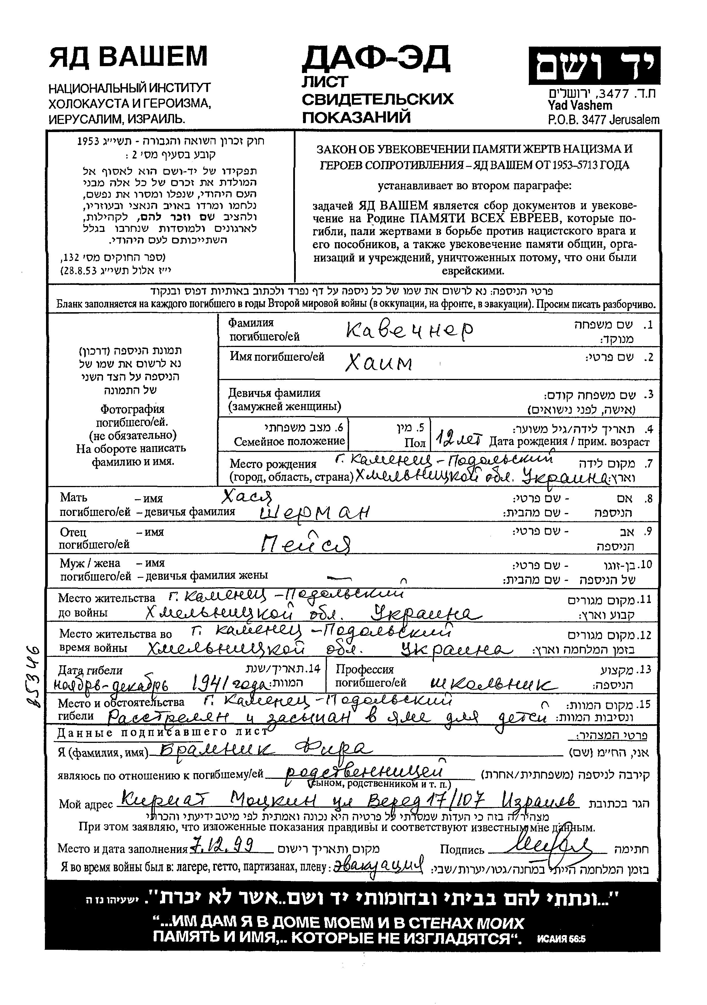 Khaim wurde in der Schoah ermordet. Todesort: Kamenets Podolskiy, Ukraine (UdSSR) im Jahr 1941.