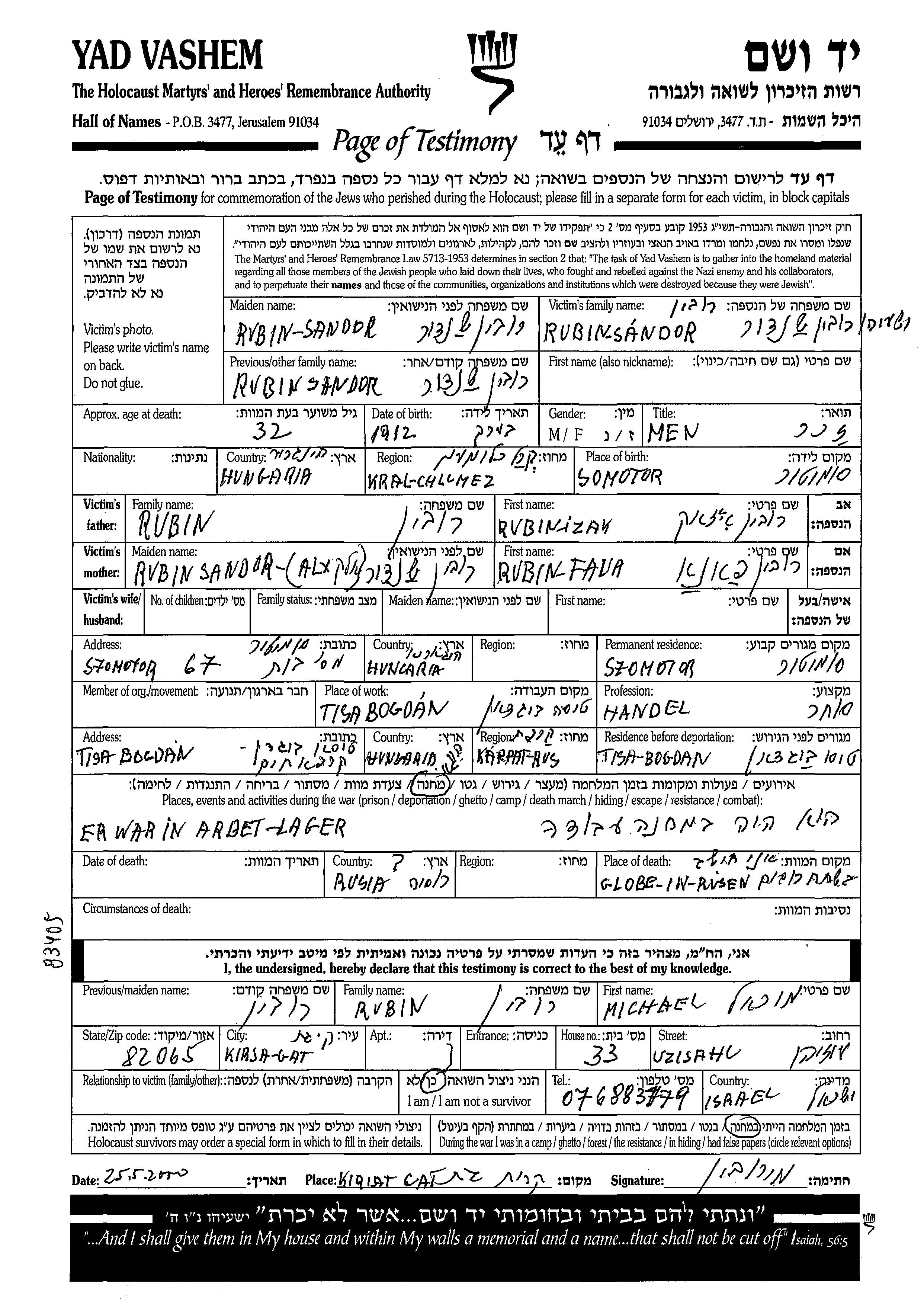 Sandor wurde in der Schoah ermordet. Todesort: Ruseni, Rumänien.