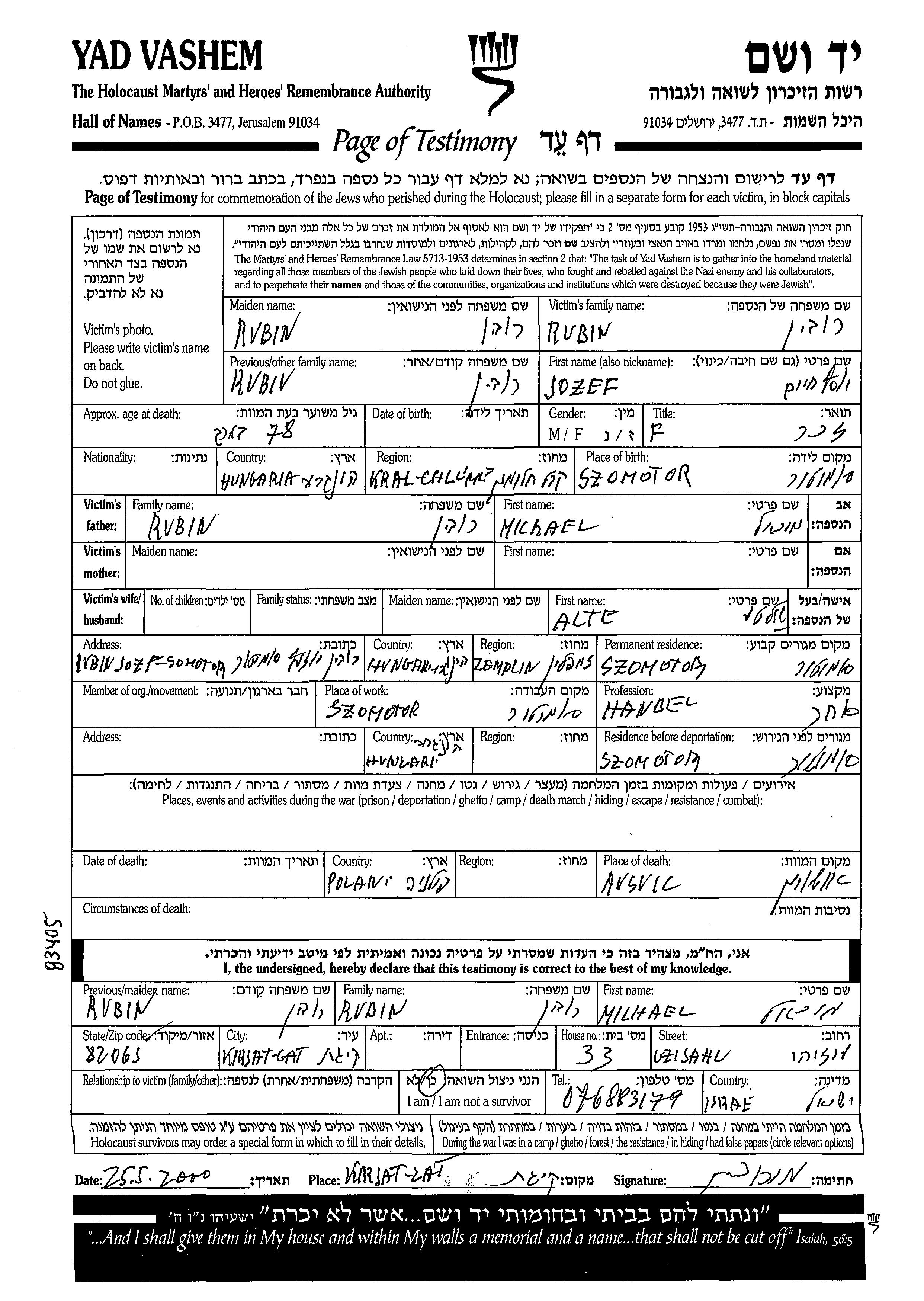 Jozef Khaim Rubin wurde in Szomotor, Tschechoslowakei geboren. Er war der Sohn von Michael. Er war Kaufmann/-frau. Vor dem Zweiten Weltkrieg lebte er in Szomotor, Tschechoslowakei. Während des Krieges war er in Szomotor, Tschechoslowakei.