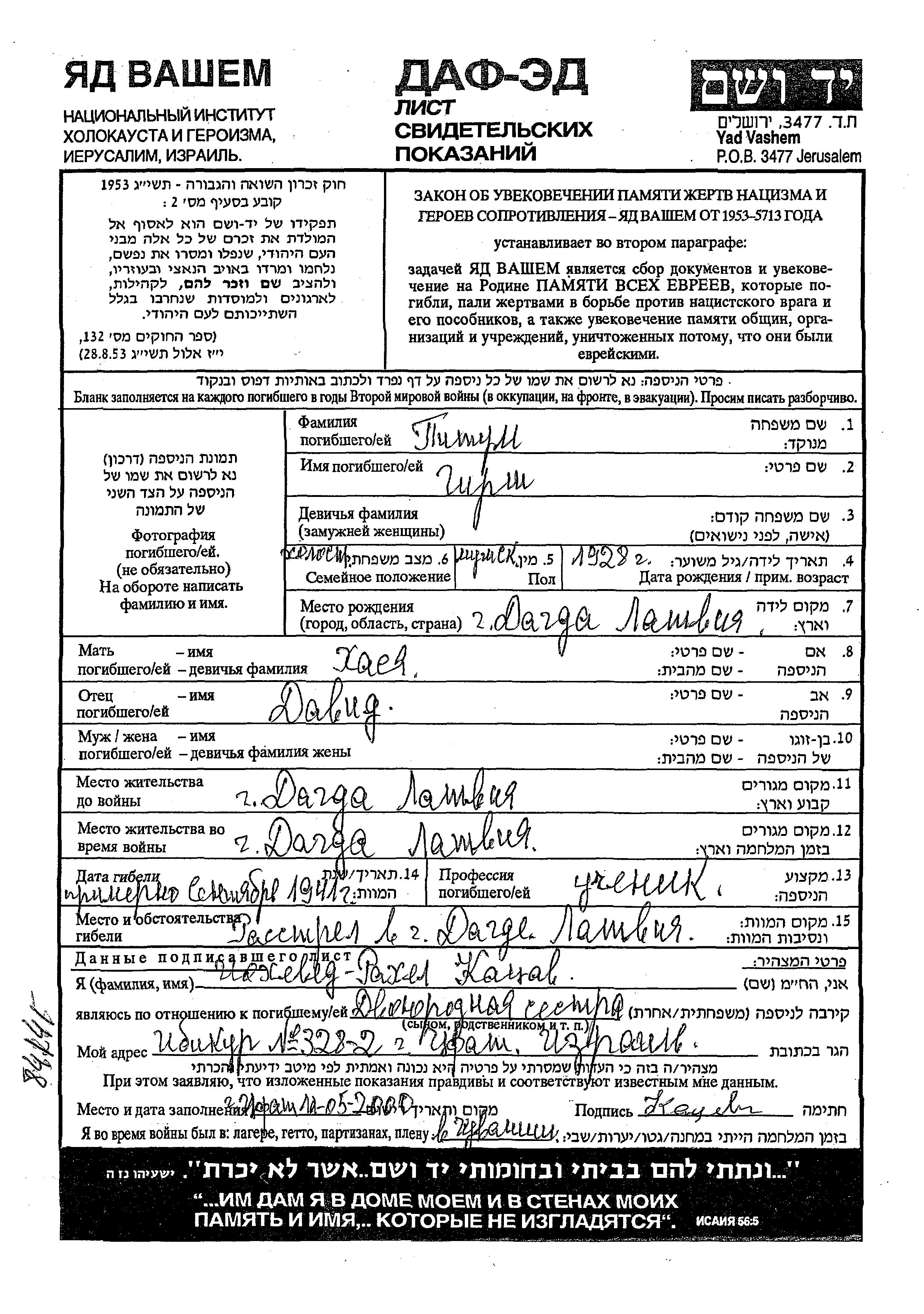 Hirsh Pitum wurde im Jahr 1928 in Dagda, Lettland geboren. Er war der Sohn von David und Khaia. Er war Schüler/-in und Ledig. Vor dem Zweiten Weltkrieg lebte er in Dagda, Lettland. Während des Krieges war er in Dagda, Lettland.