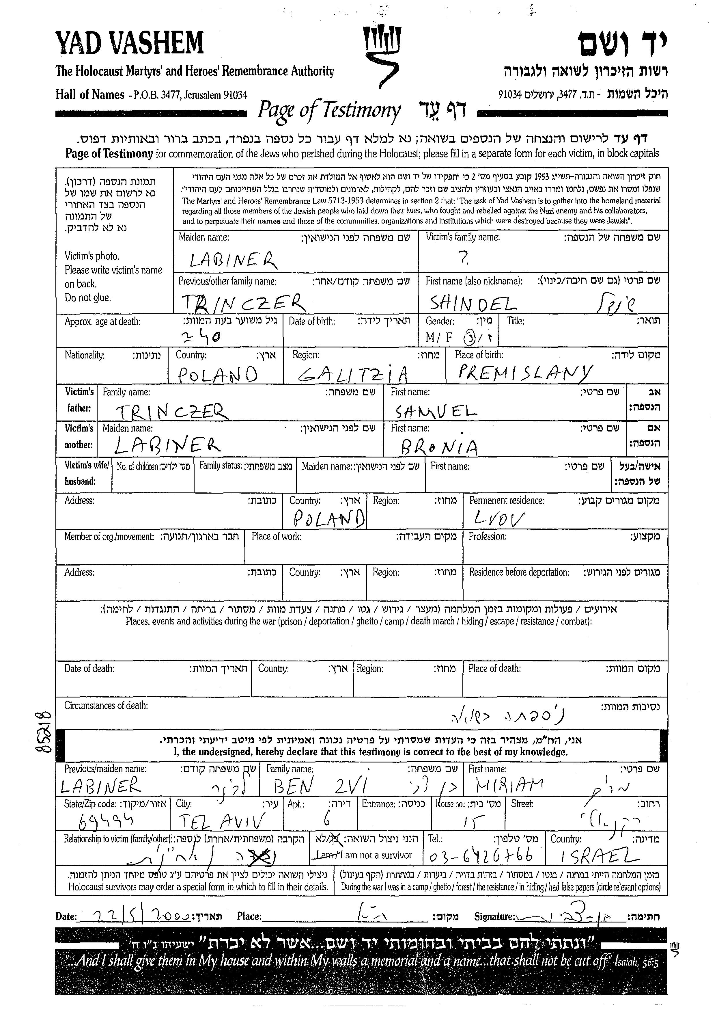 Sheindl Labiner, geb. Trinczer wurde in Przemyslany, Polen geboren. Sie war die Tochter von Shmuel und Bronia. Vor dem Zweiten Weltkrieg lebte sie in Lvov, Polen.