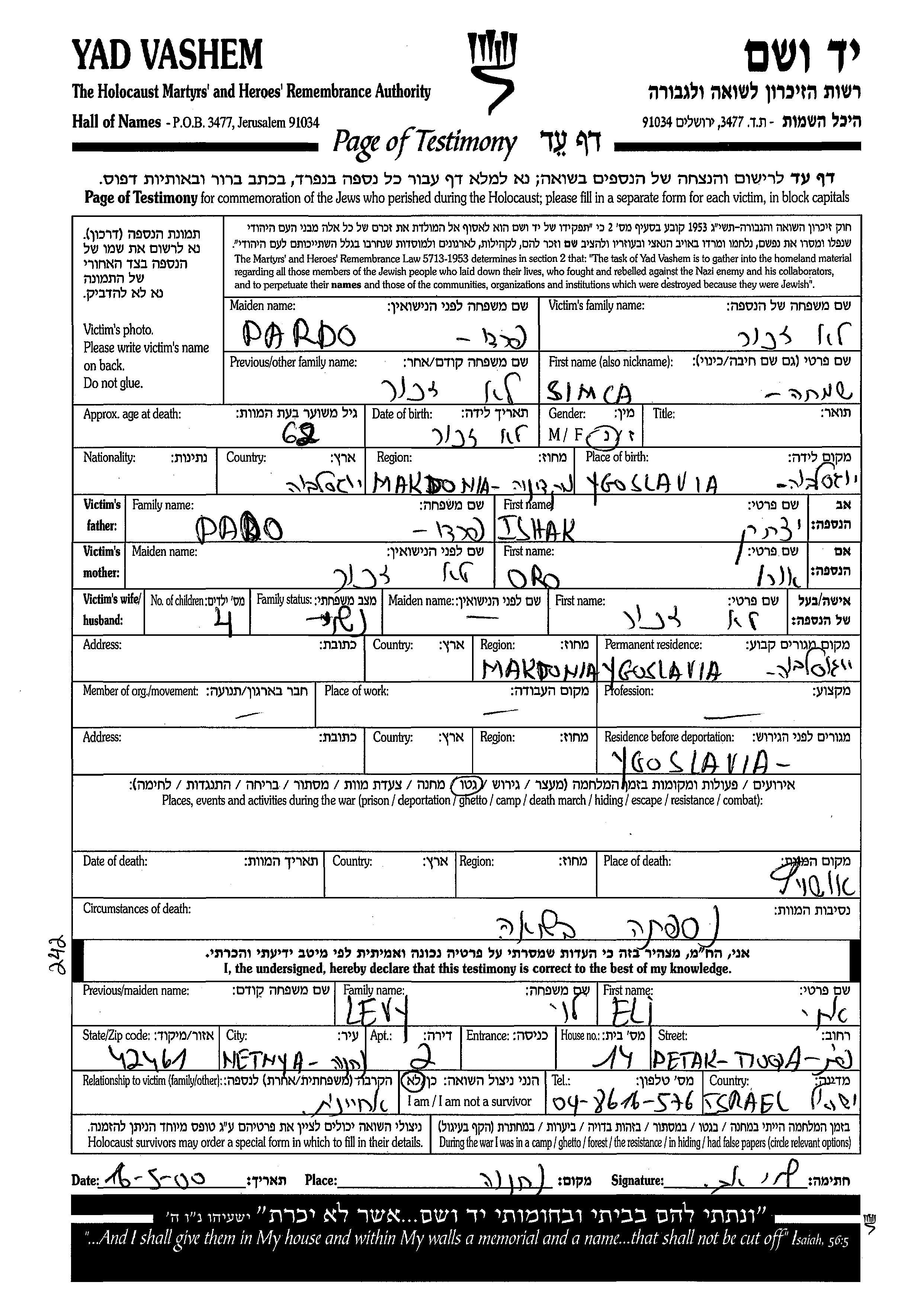 Simcha Name unbekannt, geb. Pardo wurde in Jugoslawien geboren. Sie war die Tochter von Yitzkhak und Oro. Sie war Verheiratet. Vor dem Zweiten Weltkrieg lebte sie in Jugoslawien. Während des Krieges war sie in Jugoslawien.