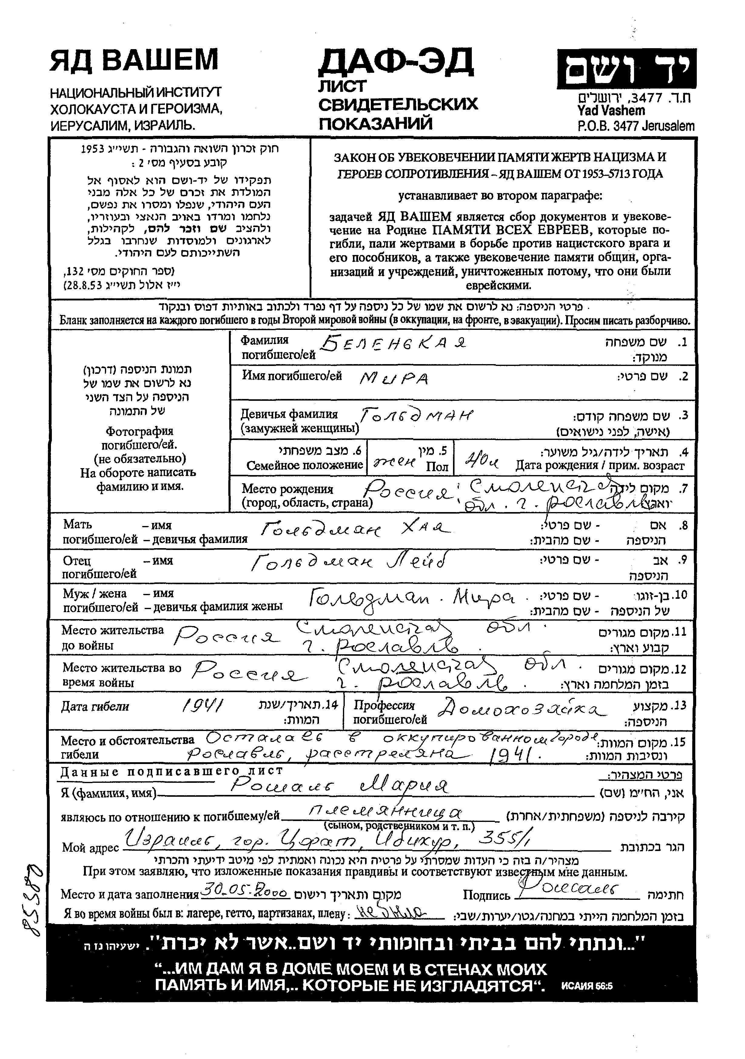 Mira Belenki, geb. Goldman wurde in Roslavl, Russland (UdSSR) geboren. Sie war die Tochter von Leib und Khaia. Sie war Hausfrau. Vor dem Zweiten Weltkrieg lebte sie in Roslavl, Russland (UdSSR). Während des Krieges war sie in Roslavl, Russland (UdSSR).