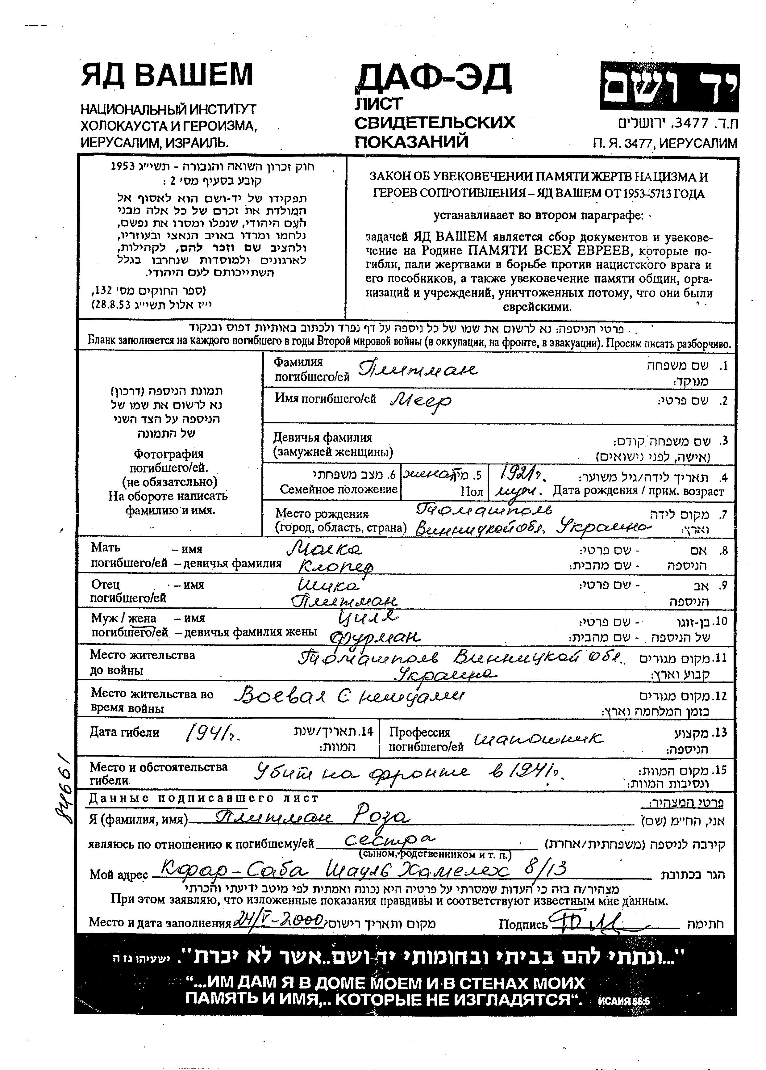 Meer Plitman wurde im Jahr 1921 in Tomashpol, Ukraine (UdSSR) geboren. Er war der Sohn von Shika und Molka. Er war Hutmacher/-in und mit Tzilya Verheiratet. Vor dem Zweiten Weltkrieg lebte er in Tomashpol, Ukraine (UdSSR). Während des Krieges war er in die Sowjetischen Streitkräfte. Meer im Militärdienst umgekommen. Todesort: die Sowjetischen Streitkräfte im Jahr 1941.