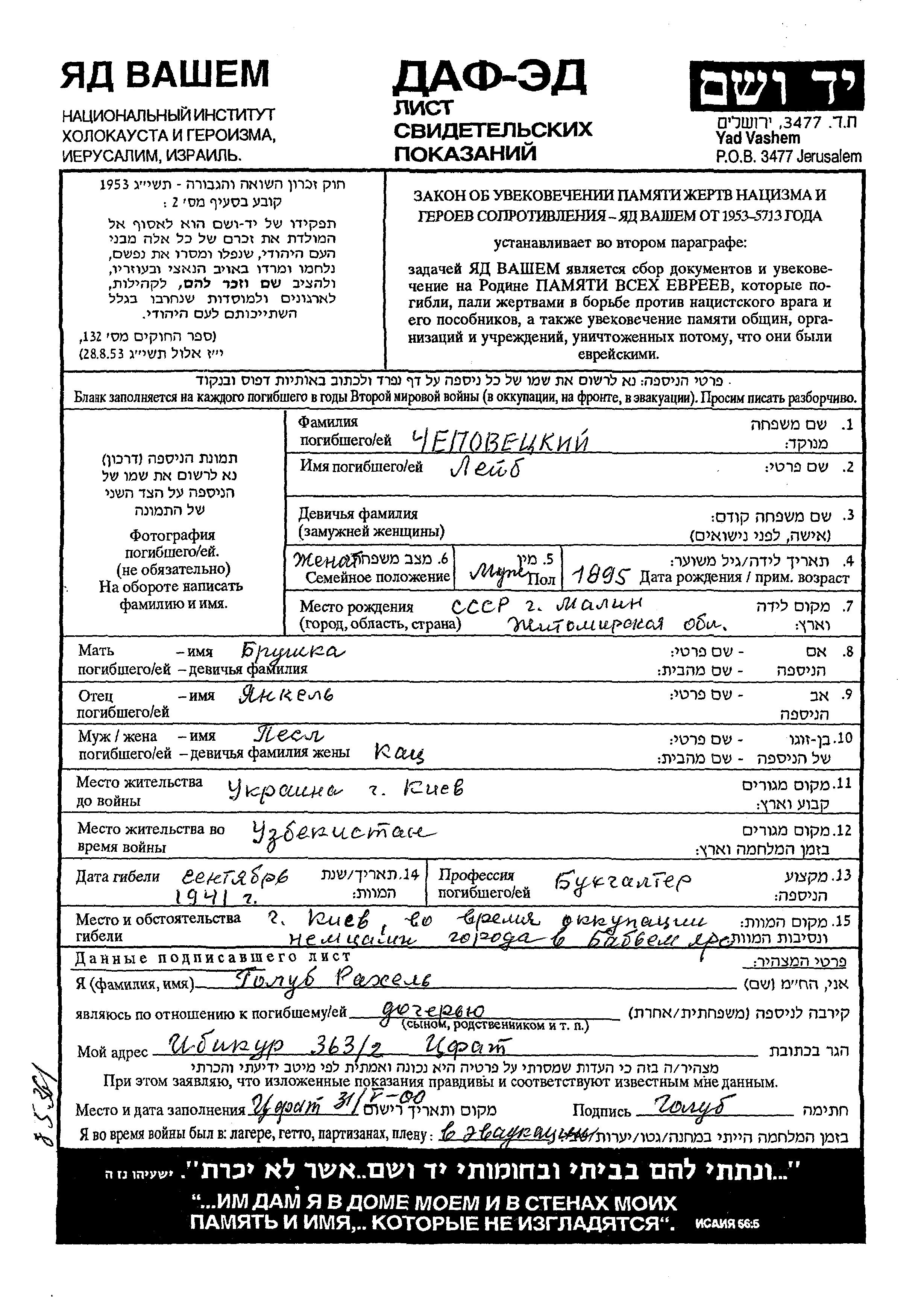 Leib Chepovetzki wurde im Jahr 1895 in Malin, Ukraine (UdSSR) geboren. Er war der Sohn von Yankel und Brushka. Er war Buchhalter/-in und mit Pesl Verheiratet. Vor dem Zweiten Weltkrieg lebte er in Kiev, Ukraine (UdSSR).