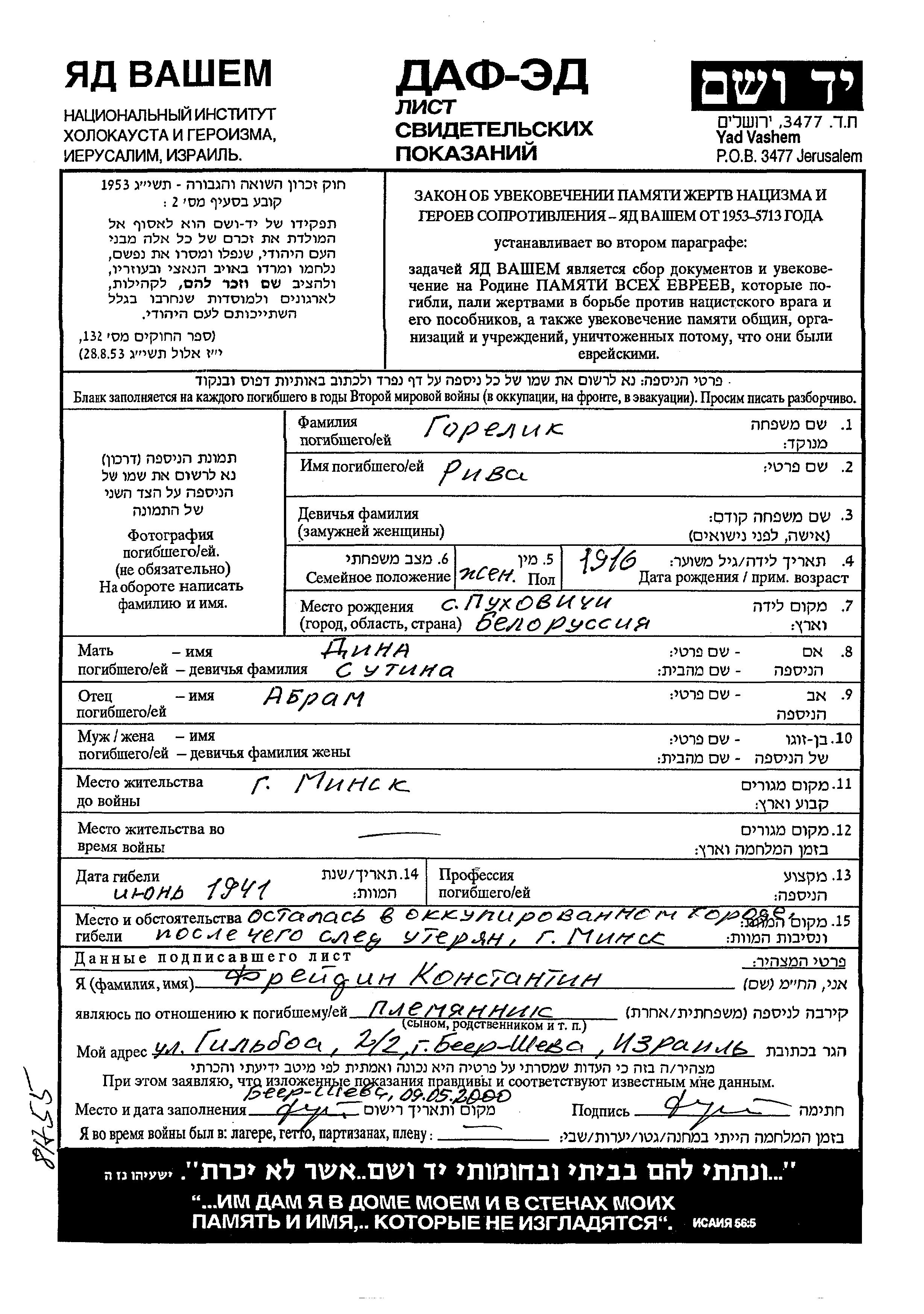 Riva Gorelik wurde im Jahr 1916 in Pukhovichi, Weißrussland (UdSSR) geboren. Sie war die Tochter von Abram und Dina. Vor dem Zweiten Weltkrieg lebte sie in Minsk, Weißrussland (UdSSR). Während des Krieges war sie in Minsk, Weißrussland (UdSSR).