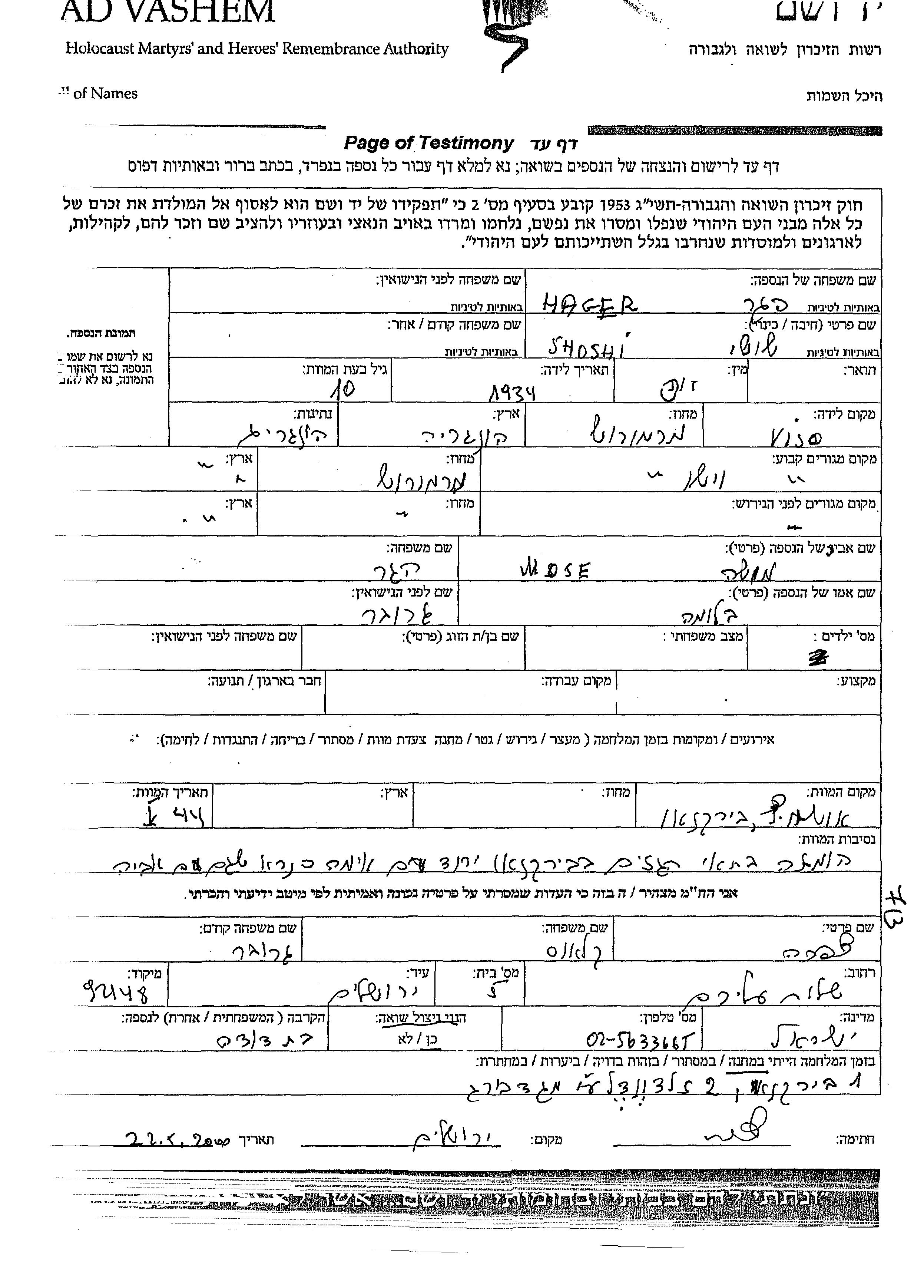 Shoshi wurde in der Schoah ermordet. Todesort: Auschwitz, Polen im Jahr 1944.