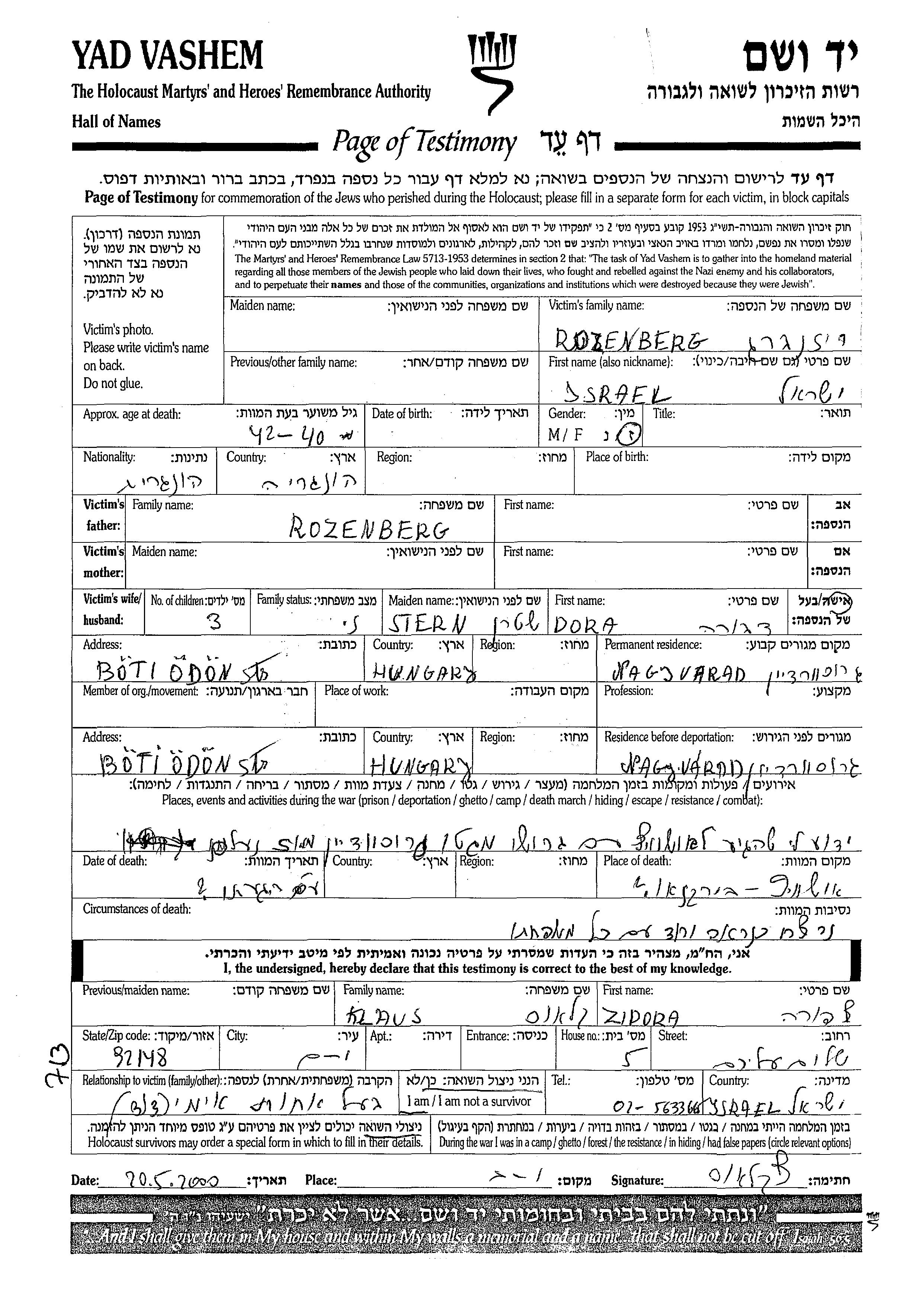 Israel Rozenberg wurde in Ungarn geboren. Er war mit Dora Dvora, geb. Stern Verheiratet. Vor dem Zweiten Weltkrieg lebte er in Nagyvarad, Rumänien. Während des Krieges war er in Nagyvarad, Rumänien.