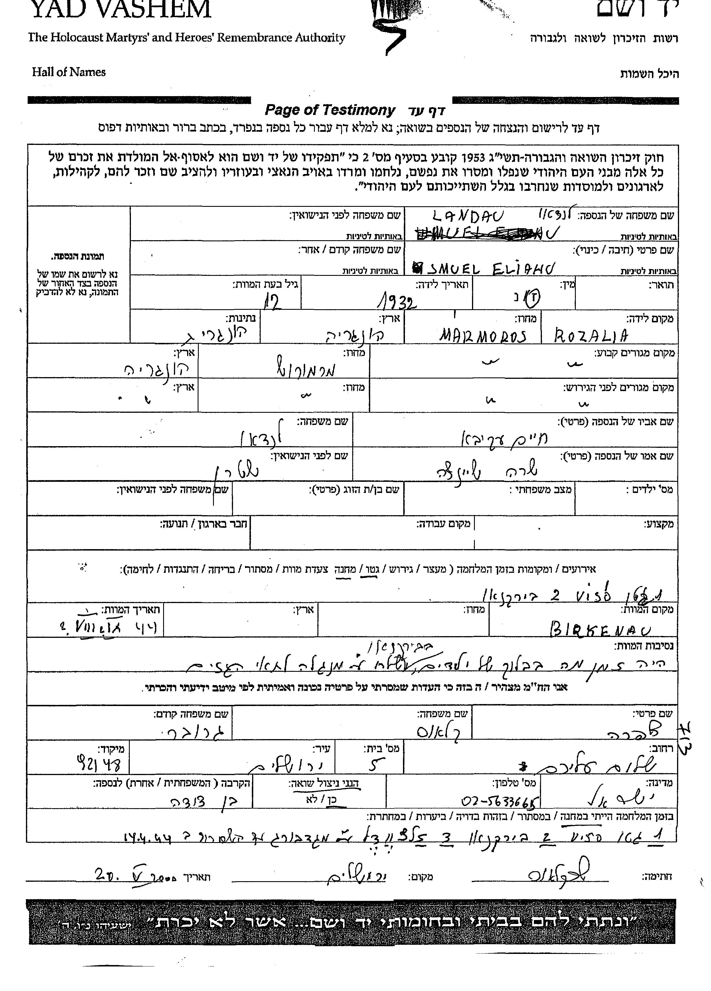 Smuel Eliahu Landau wurde im Jahr 1932 in Rozalia, Rumänien geboren. Er war der Sohn von Khaim Akiva und Sara Sheina. Er war Kind. Vor dem Zweiten Weltkrieg lebte er in Rozalia, Rumänien. Während des Krieges war er in Rozalia, Rumänien.