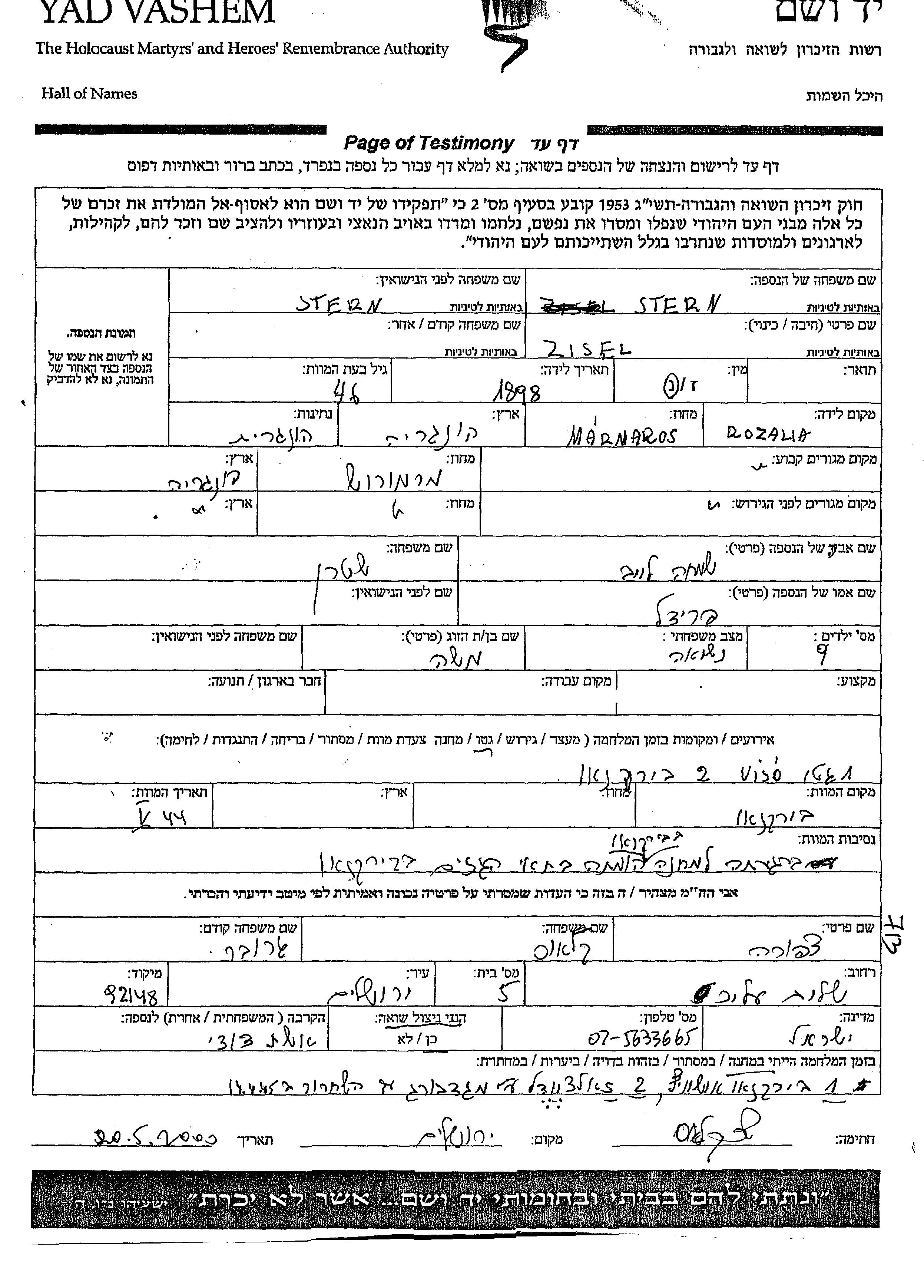 Zisel Stern, geb. Stern wurde im Jahr 1898 in Rozalia, Rumänien geboren. Sie war die Tochter von Simkha Leib und Fridl. Sie war mit Moshe Verheiratet. Vor dem Zweiten Weltkrieg lebte sie in Rozalia, Rumänien. Während des Krieges war sie in Viso, Rumänien.