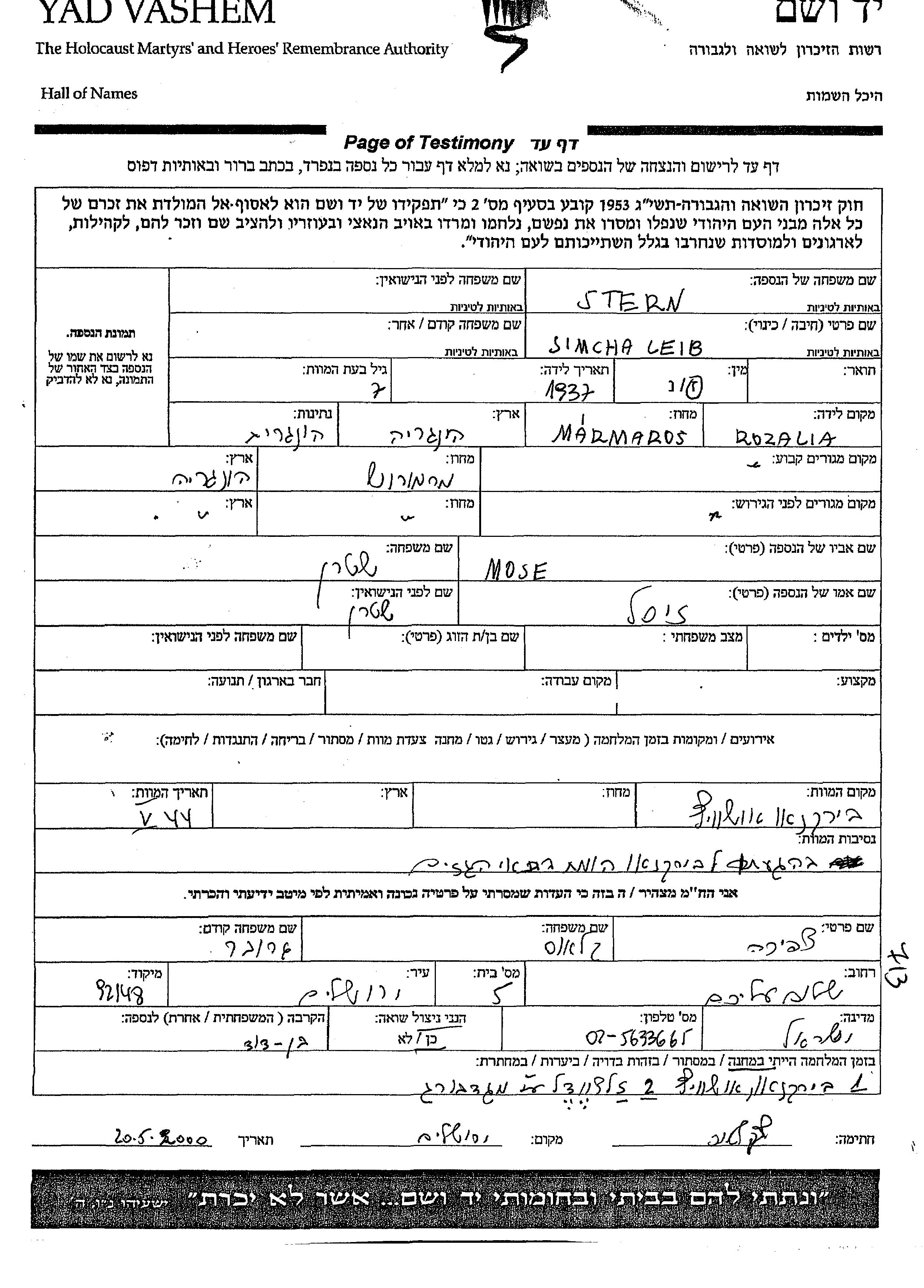 Simcha Leib Stern wurde im Jahr 1937 in Rozalia, Rumänien geboren. Er war der Sohn von Mose und Zysl. Vor dem Zweiten Weltkrieg lebte er in Rozalia, Rumänien. Während des Krieges war er in Rozalia, Rumänien.