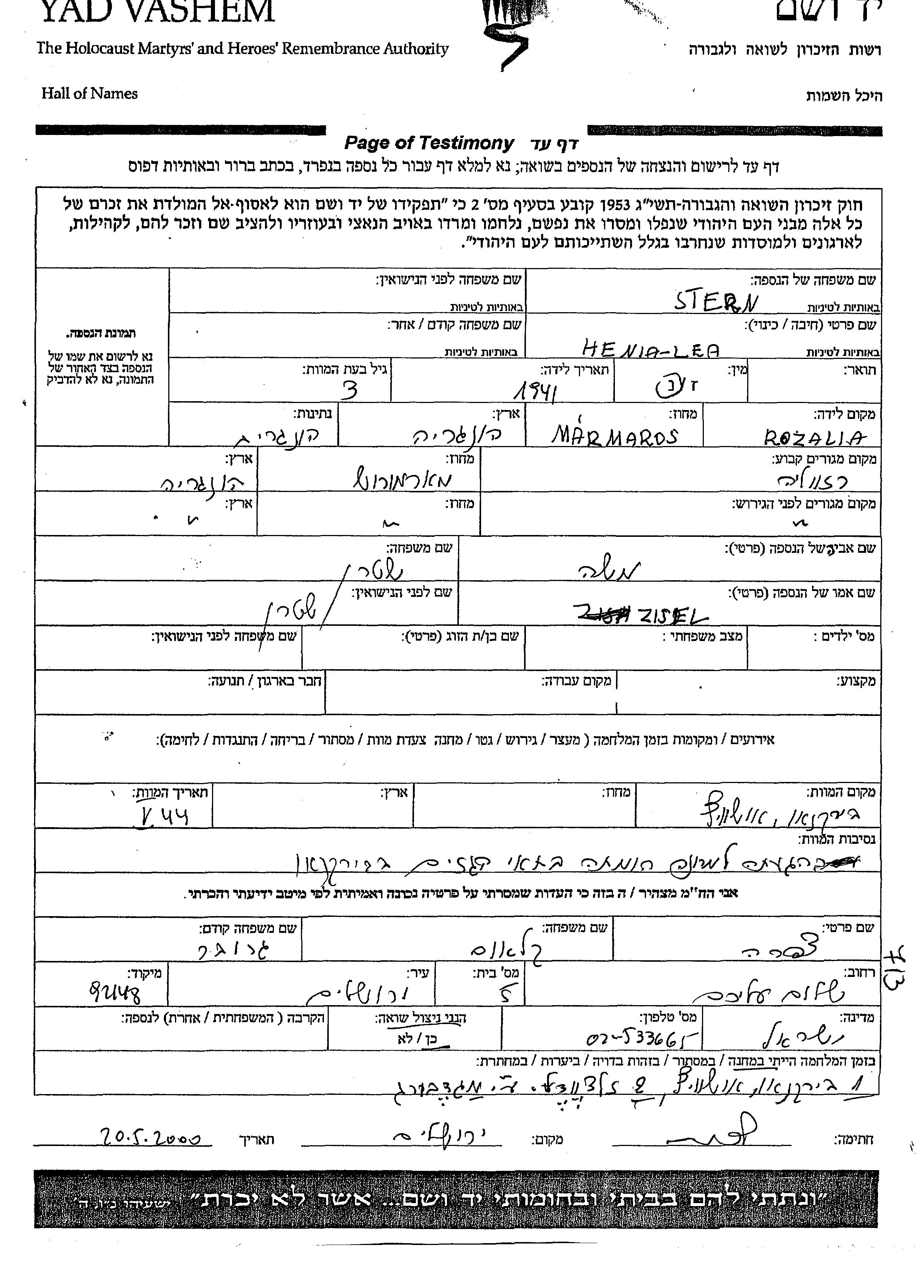 Henia Lea Stern wurde im Jahr 1941 in Rozalia, Rumänien geboren. Sie war die Tochter von Moshe und Zisel. Sie war Kind. Vor dem Zweiten Weltkrieg lebte sie in Rozalia, Rumänien. Während des Krieges war sie in Rozalia.