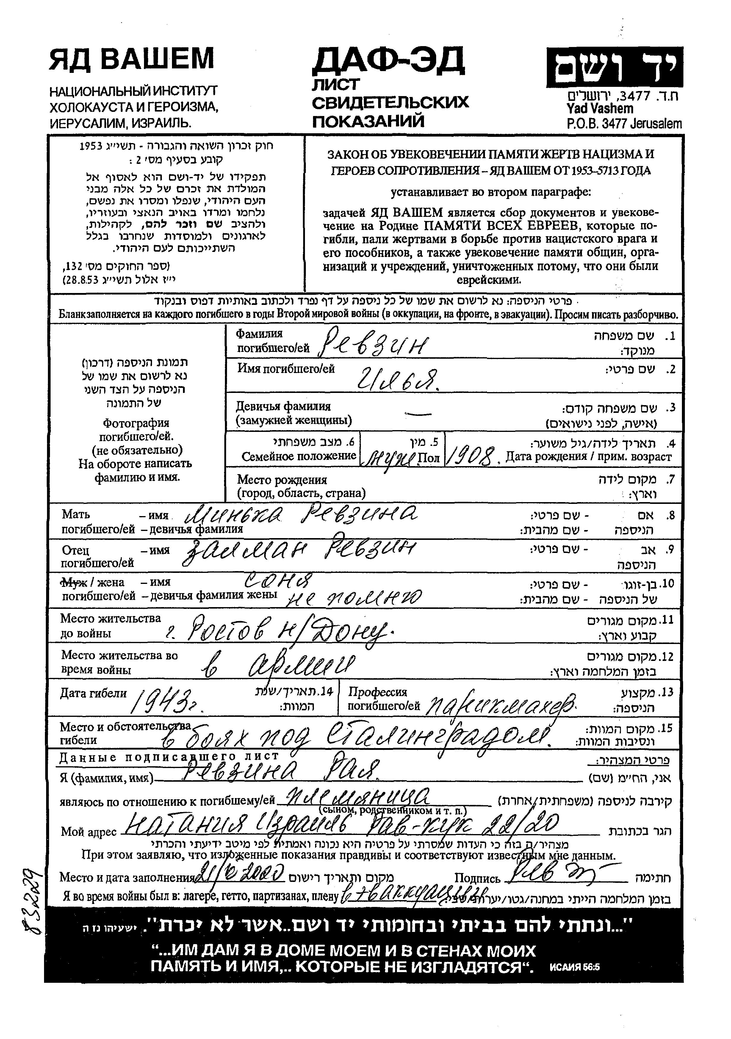 Ilya Revzin wurde im Jahr 1908 geboren. Er war der Sohn von Zalman und Minka. Er war Friseur/-in und mit Sonya Verheiratet. Vor dem Zweiten Weltkrieg lebte er in Rostov na Donu, Russland (UdSSR). Während des Krieges war er in die Sowjetischen Streitkräfte. Ilya im Militärdienst umgekommen. Todesort: Stalingrad, Russland (UdSSR) im Jahr 1943.