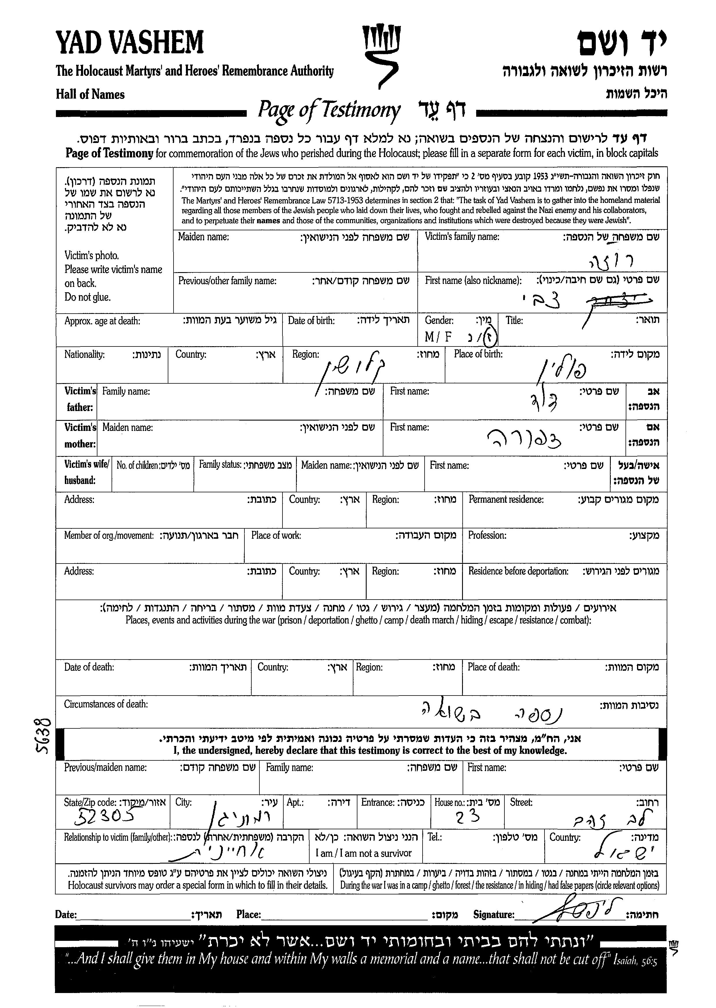 Ruza Tzvi unbekannter Ort, Gedenkblatt