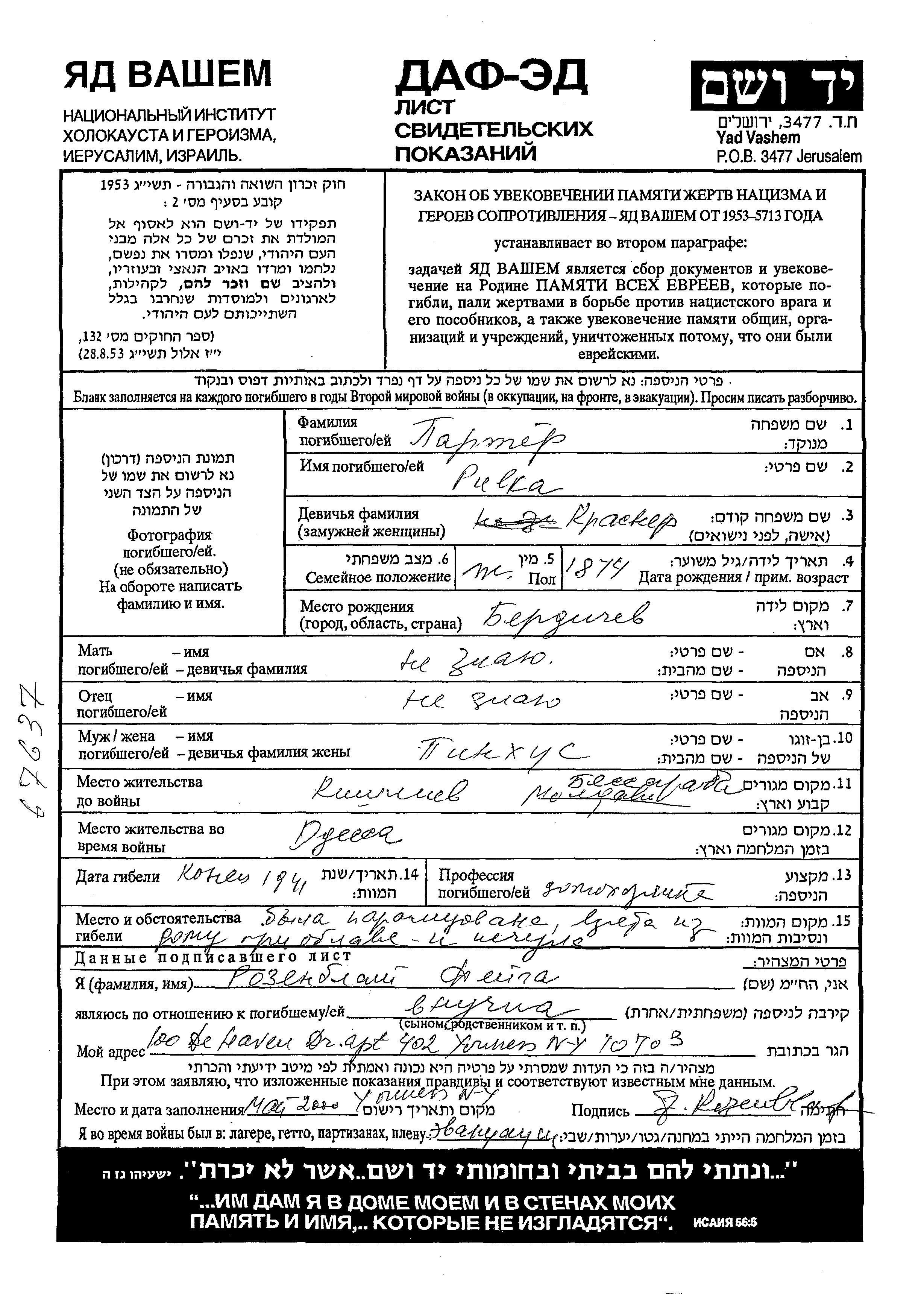 Rivka Parter Frater, geb. Krasner wurde im Jahr 1874 in Berdichev, Ukraine (UdSSR) geboren. Sie war Hausfrau. Vor dem Zweiten Weltkrieg lebte sie in Kishinev, Rumänien. Während des Krieges war sie in Odessa, Ukraine (UdSSR).