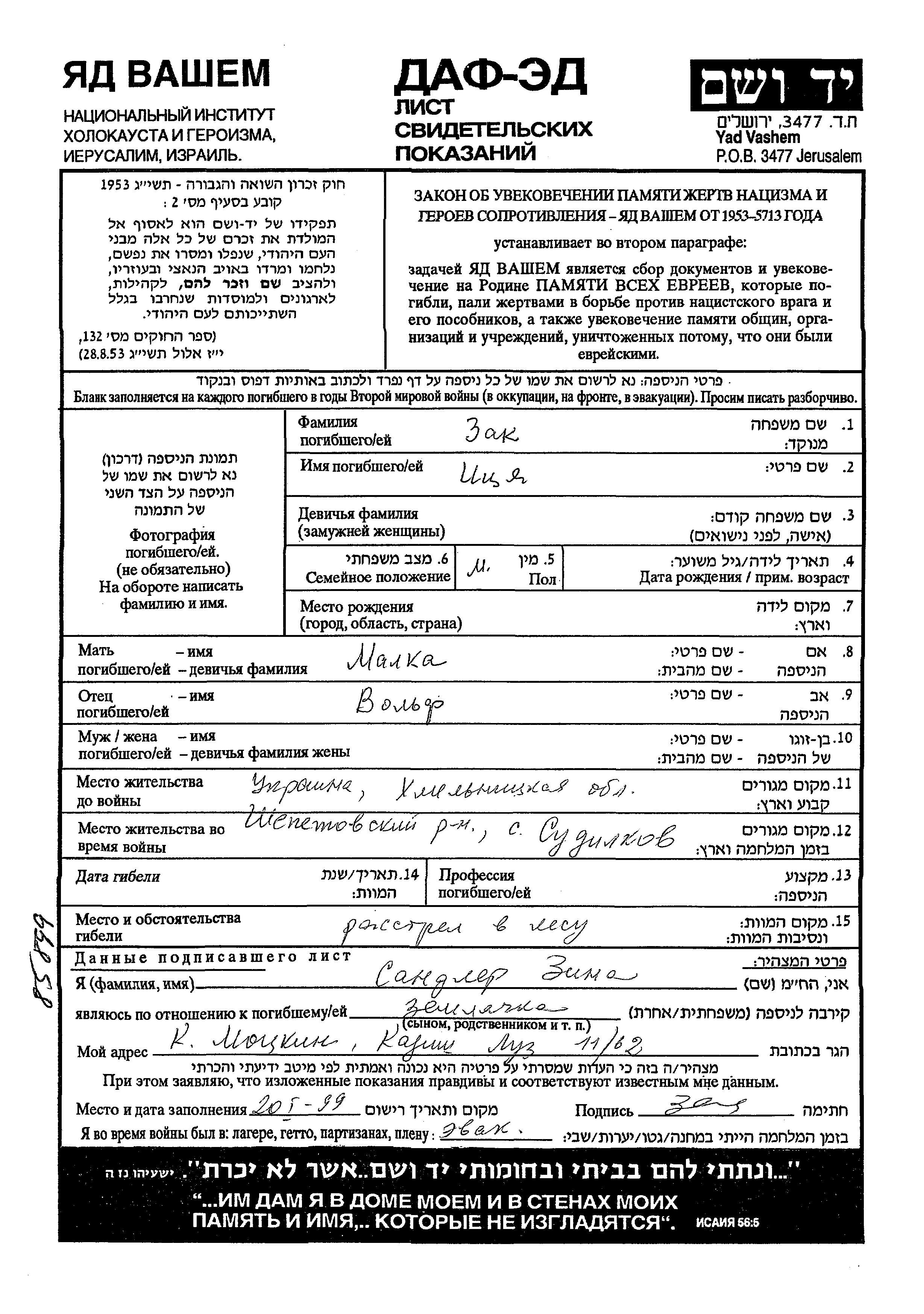 Itzya Zak wurde Er war der Sohn von Volf und Malka. Vor dem Zweiten Weltkrieg lebte er in Khmelnitski, Ukraine (UdSSR). Während des Krieges war er in Sudilkov, Ukraine (UdSSR).