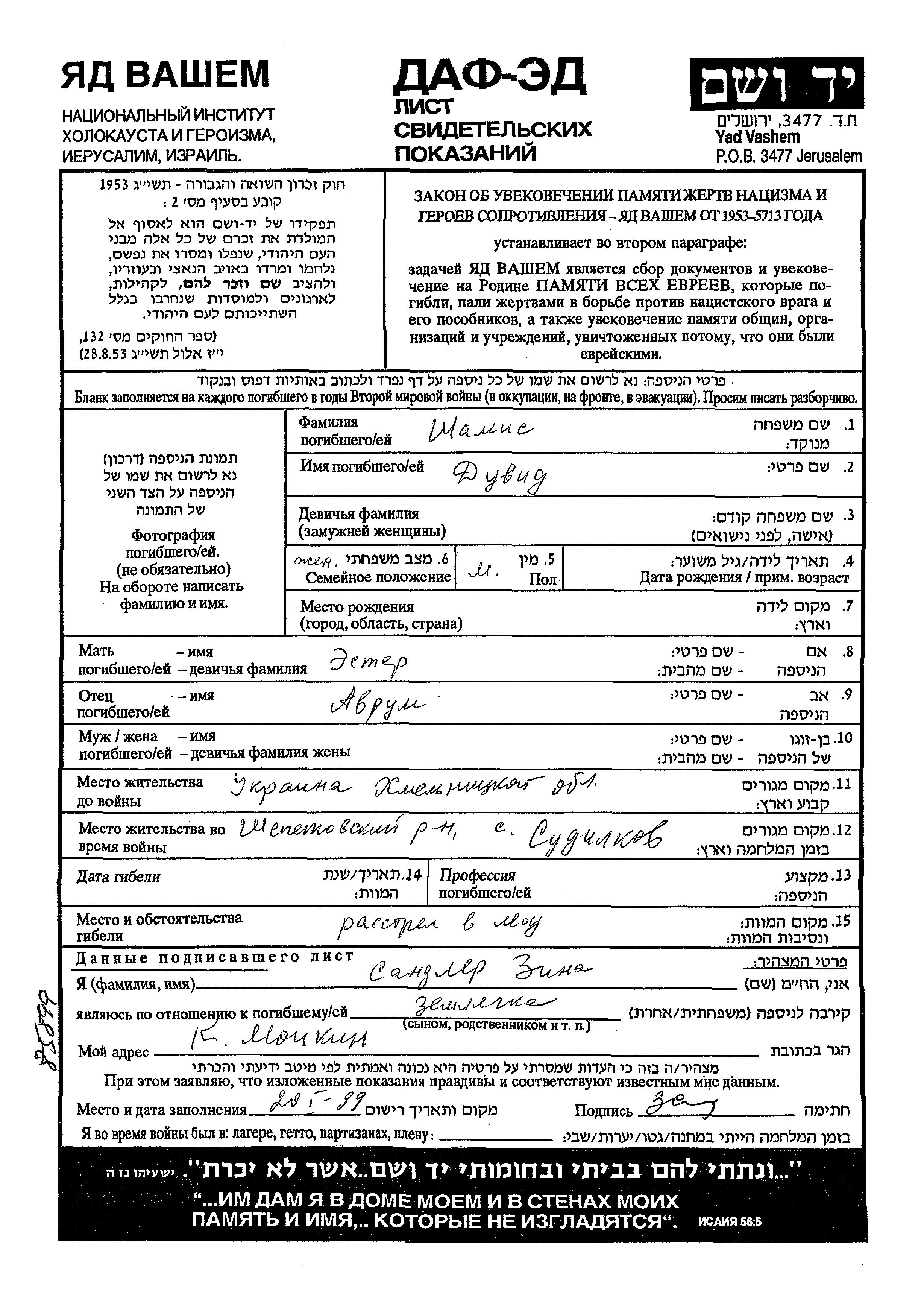 Duvid Shamis wurde Er war der Sohn von Avrum und Ester. Er war Verheiratet. Vor dem Zweiten Weltkrieg lebte er in Khmelnitski, Ukraine (UdSSR). Während des Krieges war er in Sudilkov, Ukraine (UdSSR).