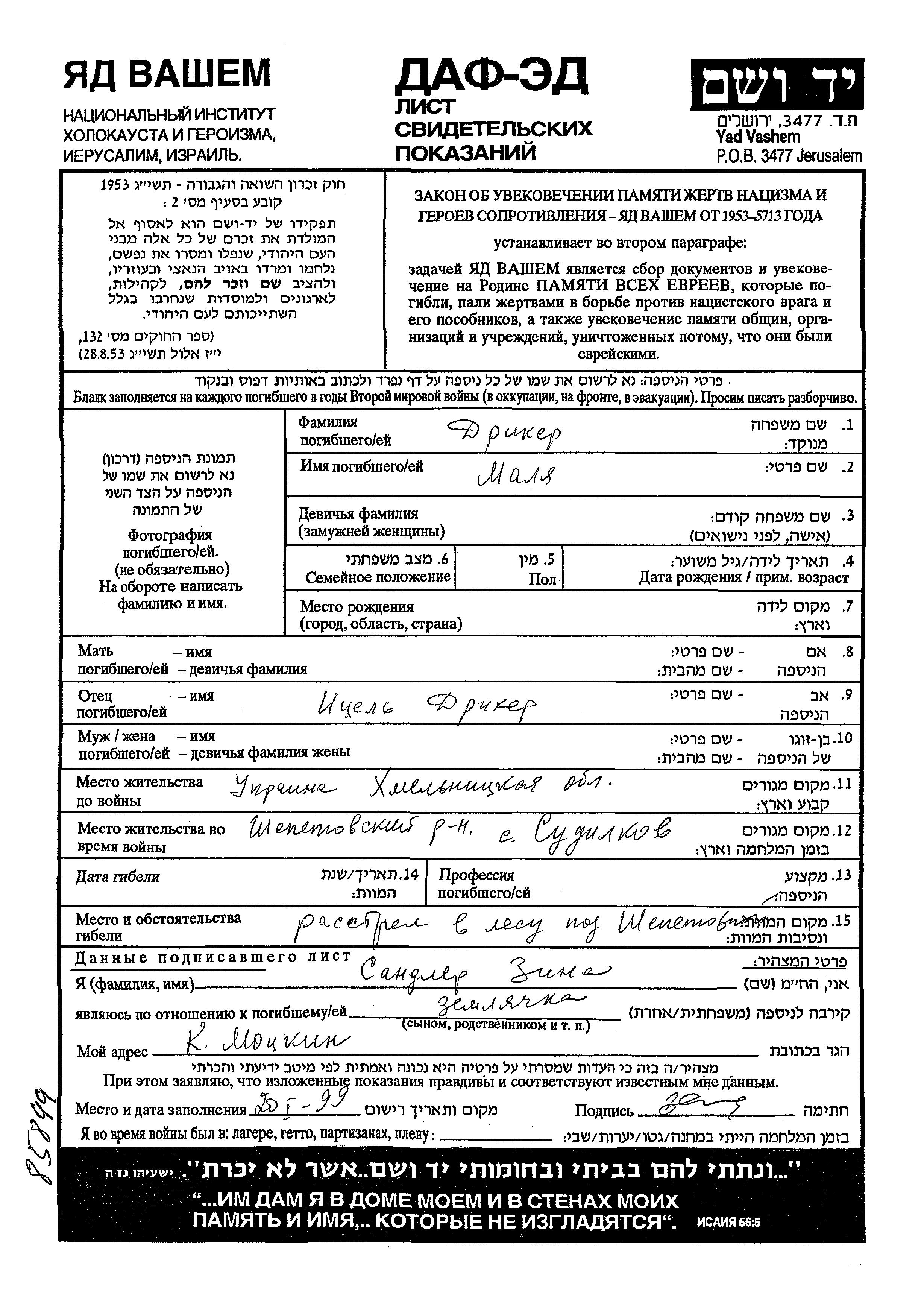 Malya Driker wurde Sie war die Tochter von Itzel. Vor dem Zweiten Weltkrieg lebte sie in Khmelnitski, Ukraine (UdSSR). Während des Krieges war sie in Sudilkov, Ukraine (UdSSR).