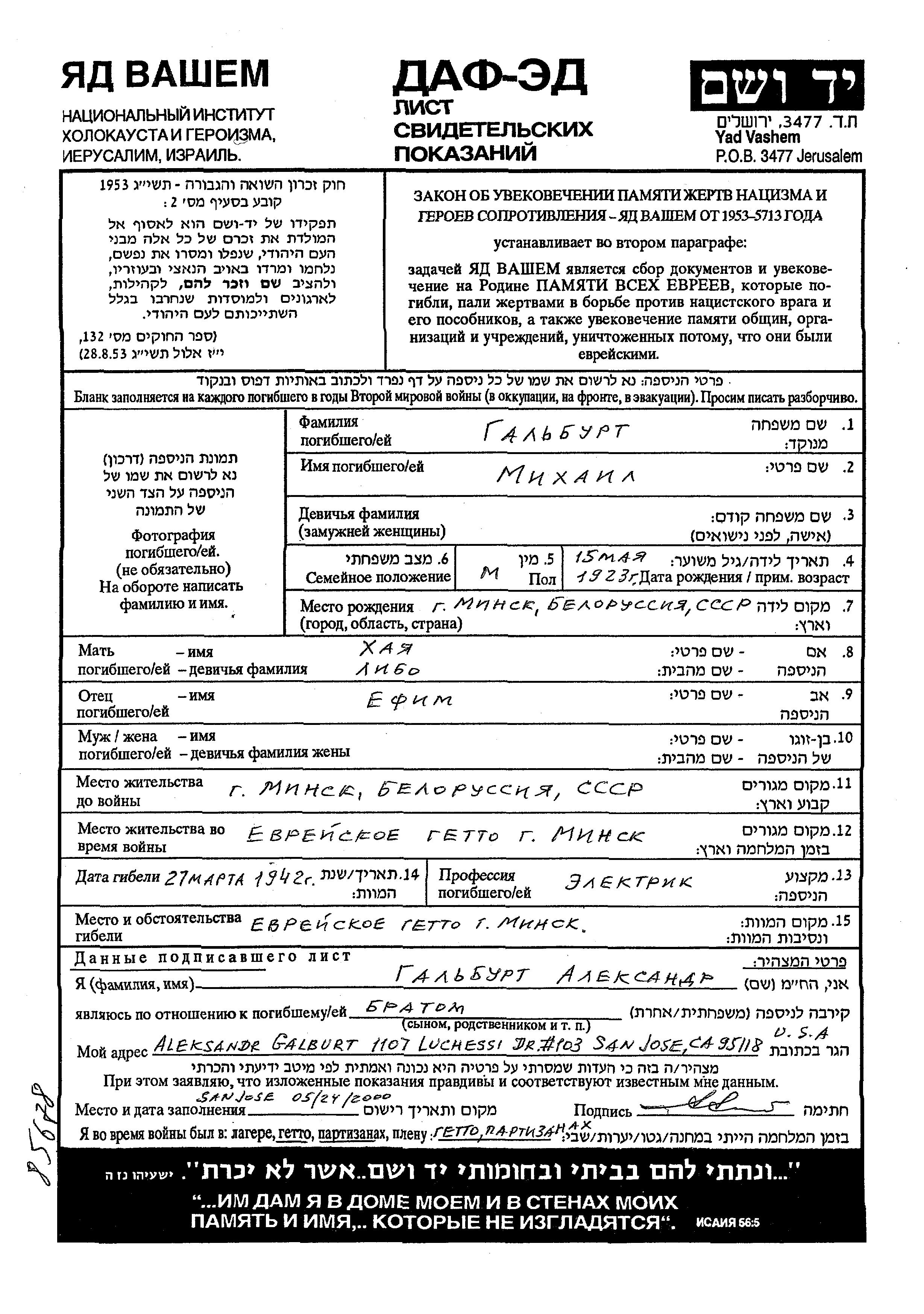 Mikhail Galburt wurde im Jahr 1923 in Minsk, Weißrussland (UdSSR) geboren. Er war der Sohn von Yefim und Khaia Libo. Er war Elektriker/-in. Vor dem Zweiten Weltkrieg lebte er in Minsk, Weißrussland (UdSSR). Während des Krieges war er in Minsk, Weißrussland (UdSSR).