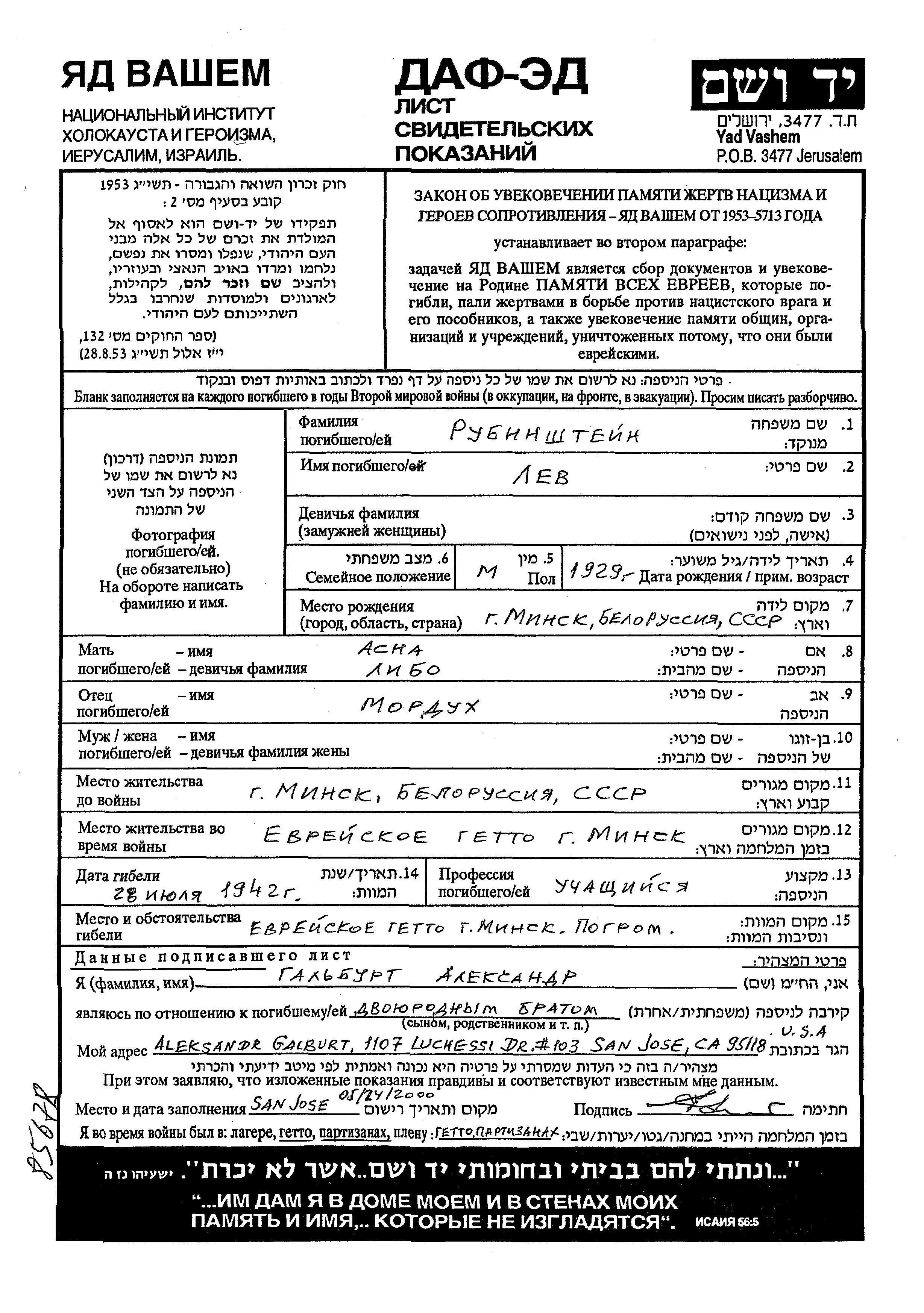 Lev Rubinshtein wurde im Jahr 1929 in Minsk, Weißrussland (UdSSR) geboren. Er war der Sohn von Mordukh und Asna. Er war Schüler/-in und Kind. Vor dem Zweiten Weltkrieg lebte er in Minsk, Weißrussland (UdSSR). Während des Krieges war er in Minsk, Weißrussland (UdSSR).